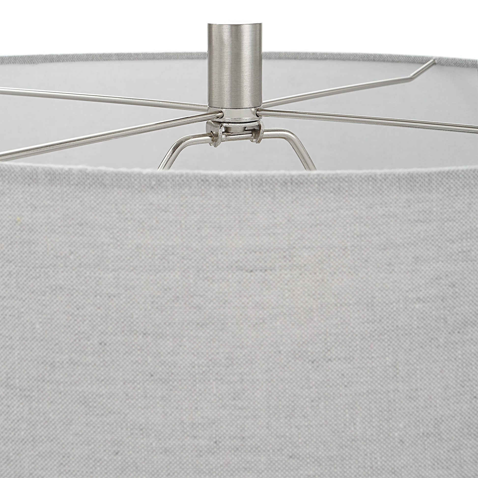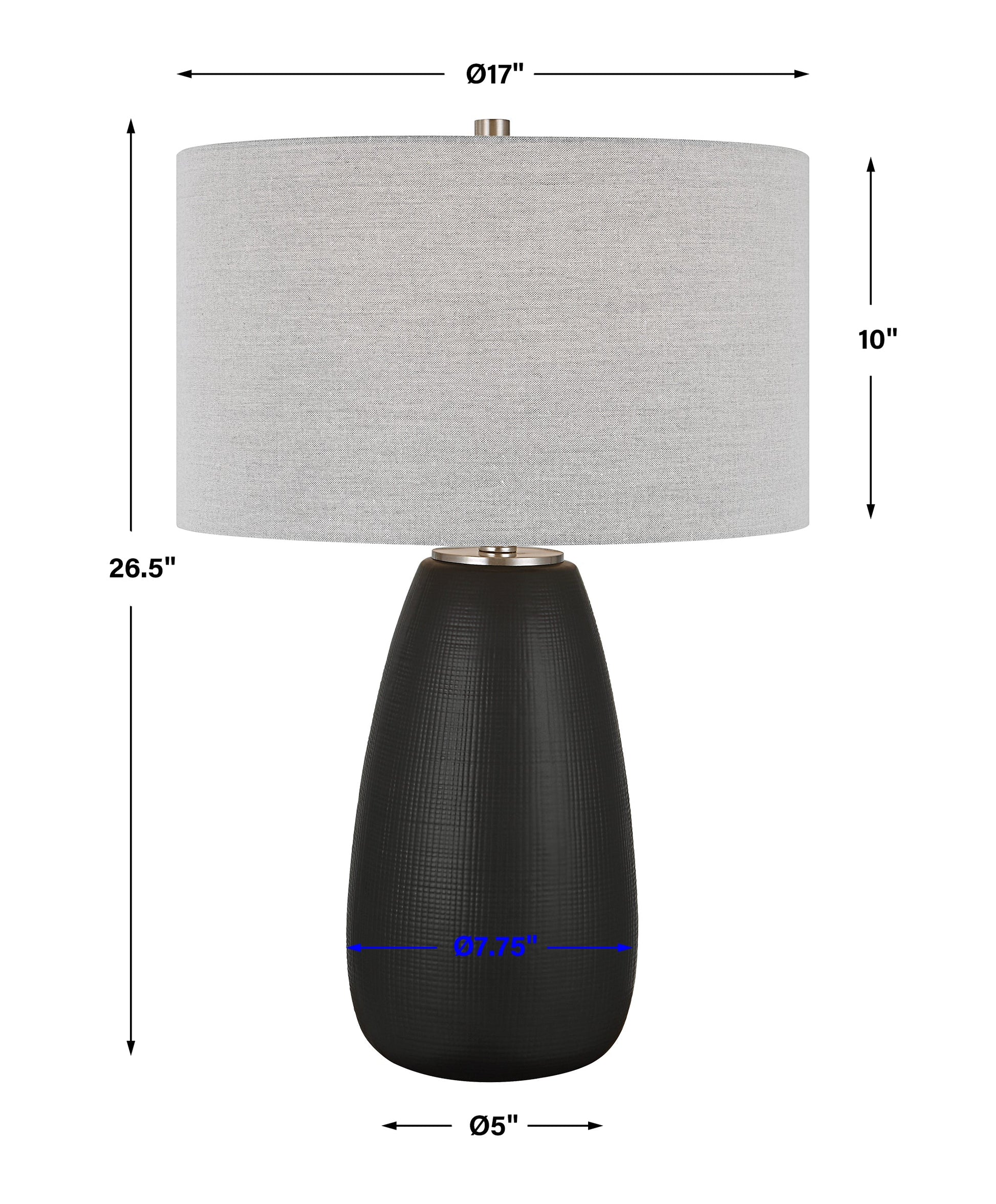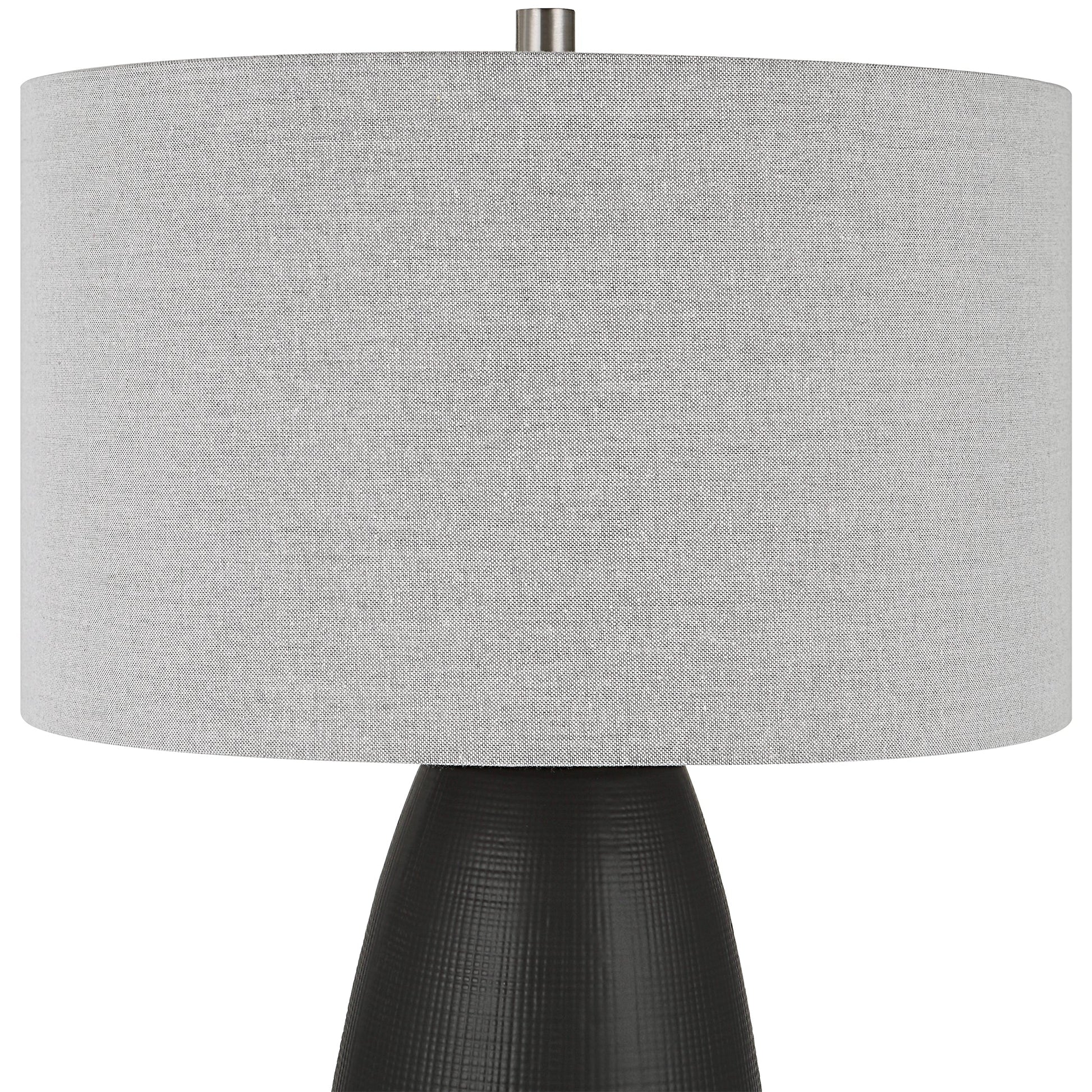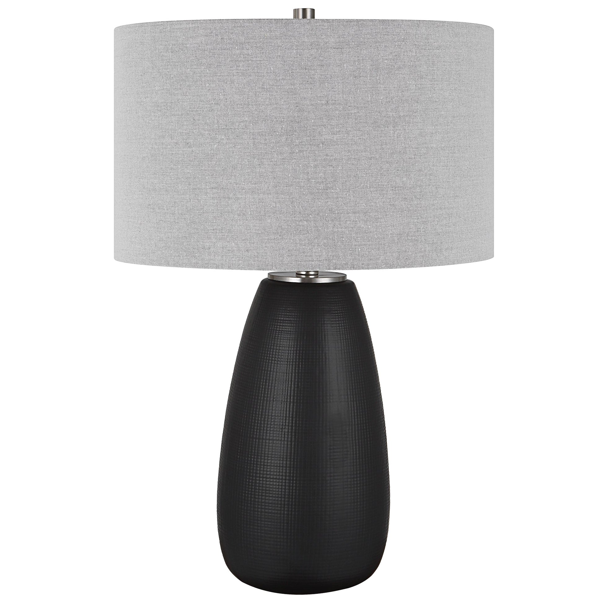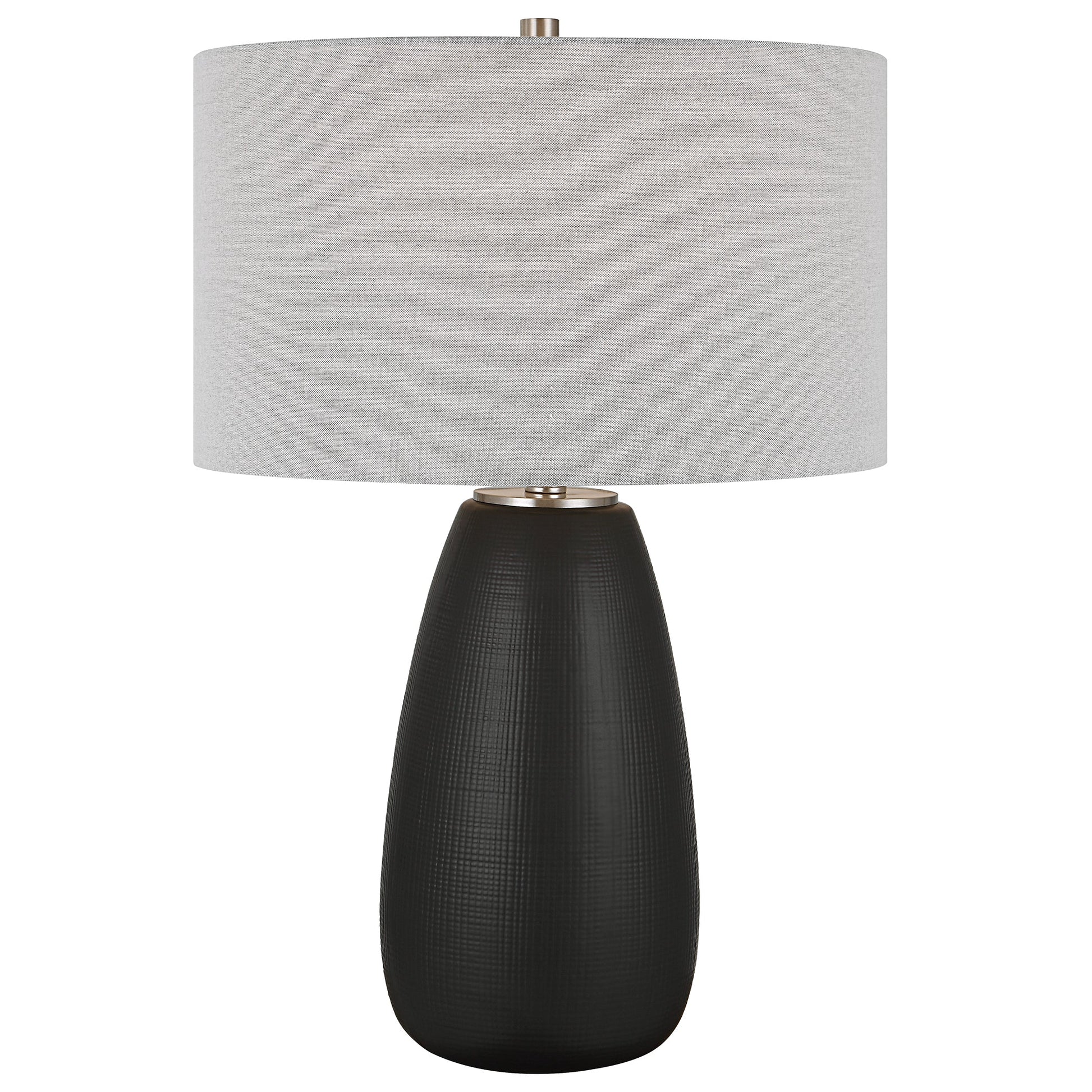 The Twilight Table Lamp Features A Ceramic Base With A Subtle Carved Gridline Texture, Finished In A Satin Black Glaze And Accented By Brushed Nickel Plated Details. The Hardback Drum Shade Is Covered In A Light Gray Linen Fabric. Overall Depth : 17 in Overall Width : 17 in Overall Height : 26.5 in