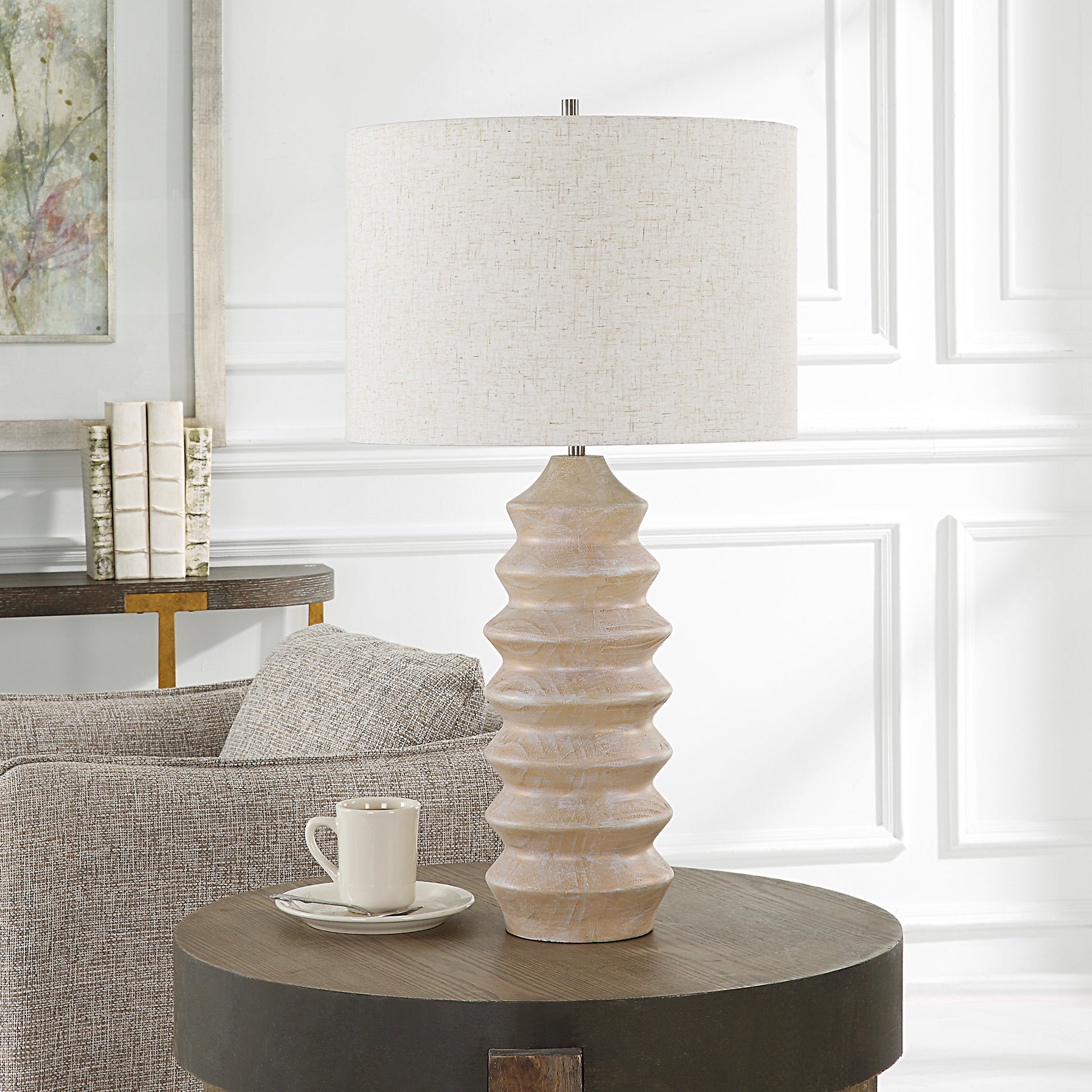 The Uplift Table Lamp Showcases A Geometric Carved Base In A Bleached Wood Tone Look With Nickel Plated Iron Details. The Lamp Is Paired With A Casual Oatmeal Linen Slubbed Drum Shade. Overall Depth : 16 in Overall Width : 16 in Overall Height : 30 in