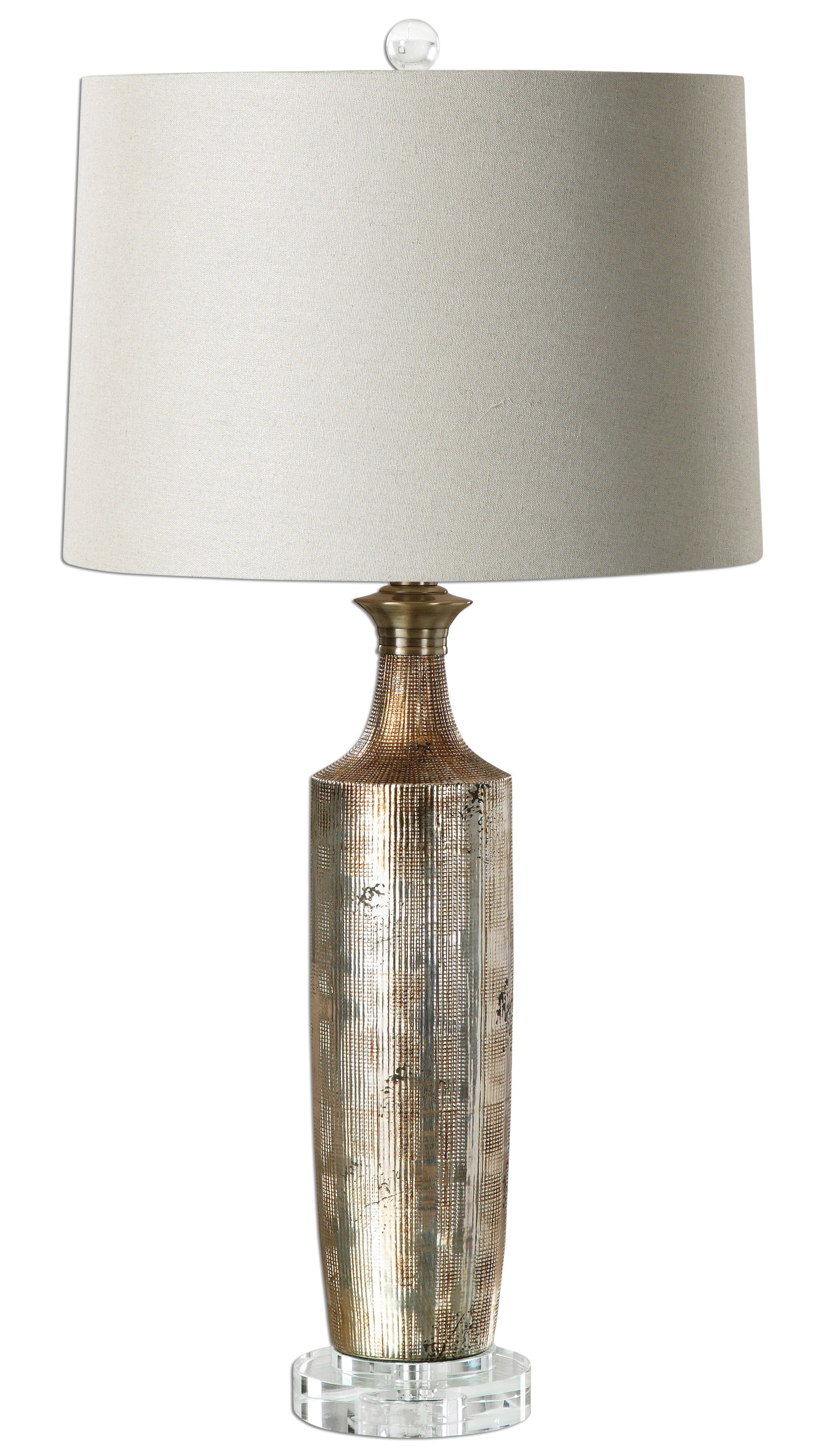 Textured Ceramic Base Finished In A Metallic Bronze Glaze Accented With Crystal Details. The Slightly Tapered Round Hardback Shade Is A Beige Linen Fabric. Due To The Nature Of Fired Glazes On Ceramic Lamps, Finishes Will Vary Slightly. Overall Depth : 15 in Overall Width : 14 in Overall Height : 29.5 in