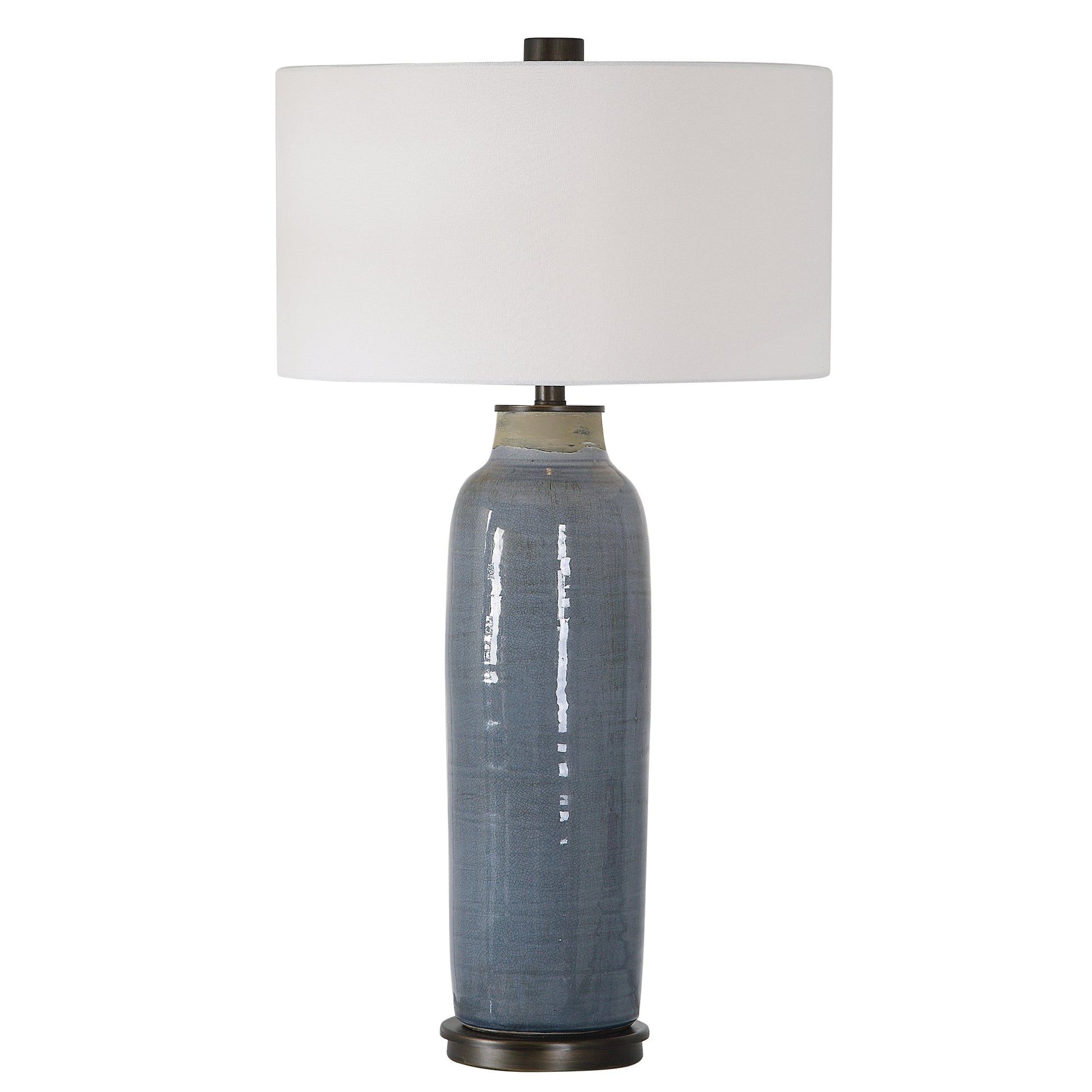 This Table Lamp Lends A Touch Of Old-world, Handcrafted Style With This Ceramic Base Finished In A Distressed Slate Blue Glaze Accented With Oil Rubbed Bronze Accents. The Round Hardback Drum Shade Is A White Linen Fabric. Due To The Nature Of Fired Glazes On Ceramic Lamps, Finishes Will Vary Slightly. Overall Depth : 18 in Overall Width : 18 in Overall Height : 33.5 in