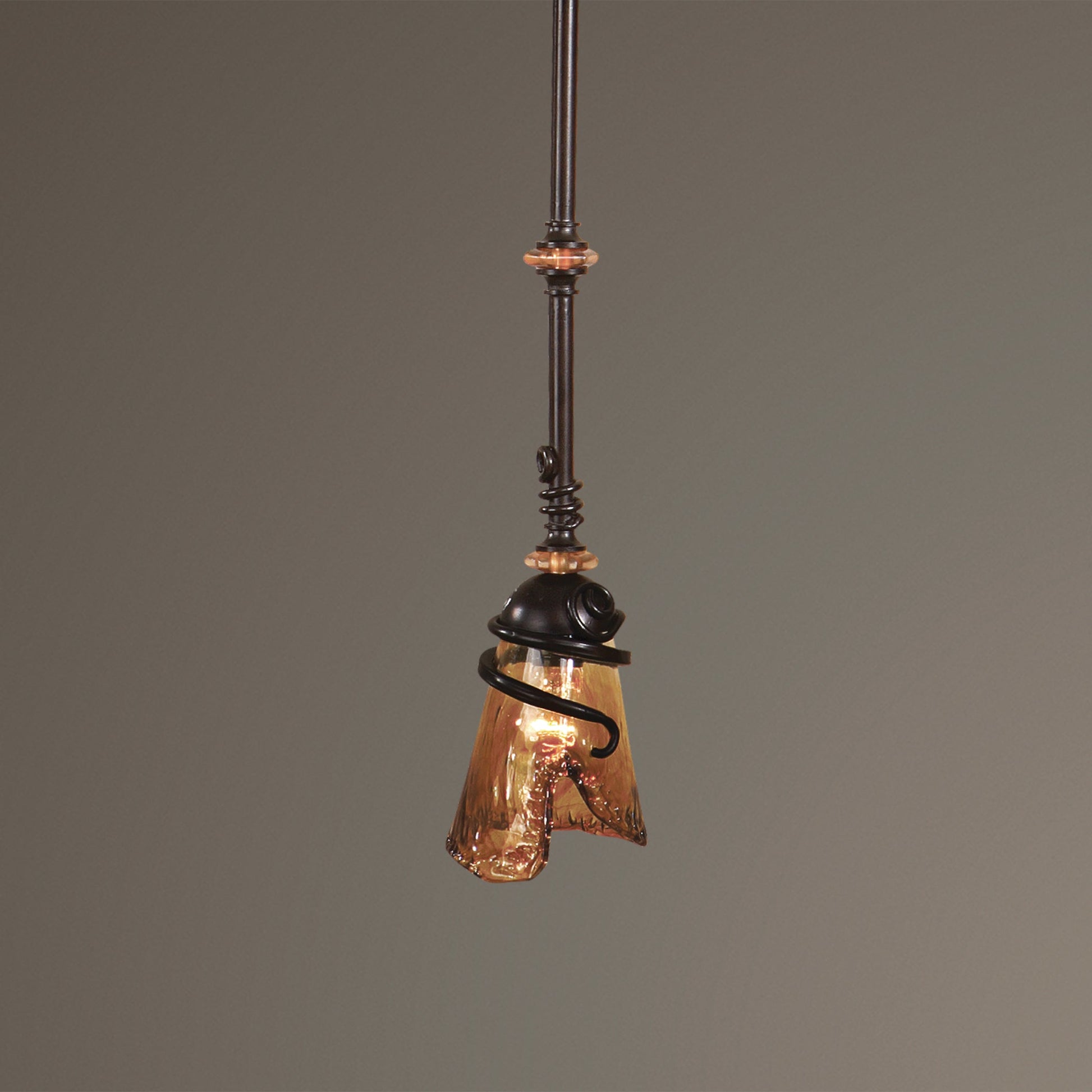 Hand Wrought, Oil Rubbed Bronze Metal Curls Around A Heavy, Handmade Glass. Its Amber Tonalities Are Key In This Exciting Mix Of Materials. 1-100 Watt Max, Edison Socket. Bulb Not Included. Supplied With 15' Wire And 4' Chain For Adjustable Installation. Overall Depth : 5.375 in Overall Width : 5.875 in Overall Height : 12 in