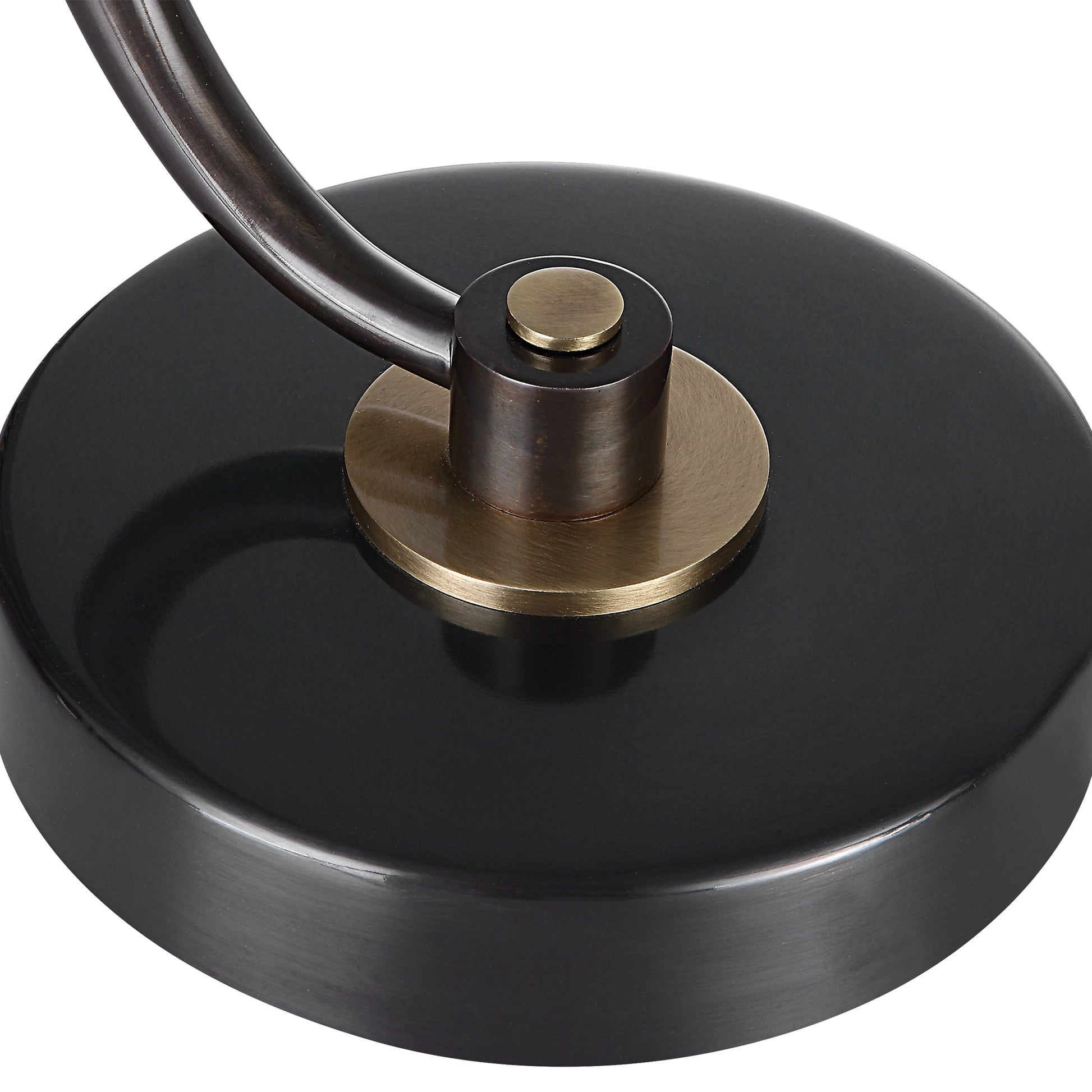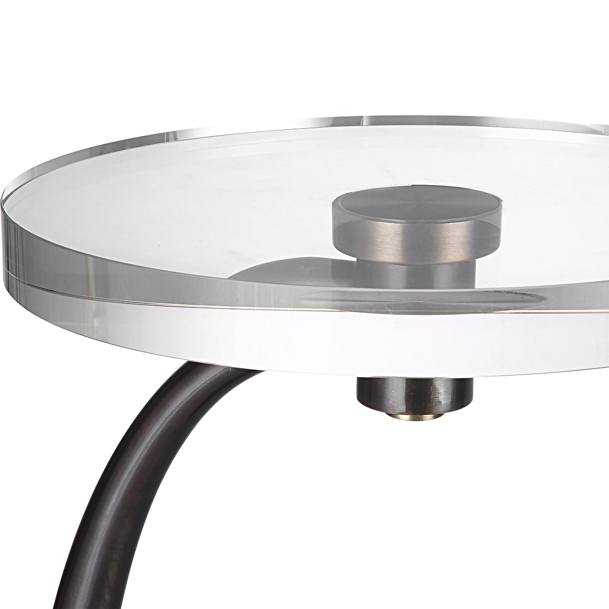 Minimal Yet Sophisticated, The Waveney Drink Table Displays A Sleek Curved Iron Base In Dark Bronze With Antique Brass Plated Accents And A Thick Crystal Top. Overall Depth : 11.5 in Overall Width : 11.5 in Overall Height : 24 in