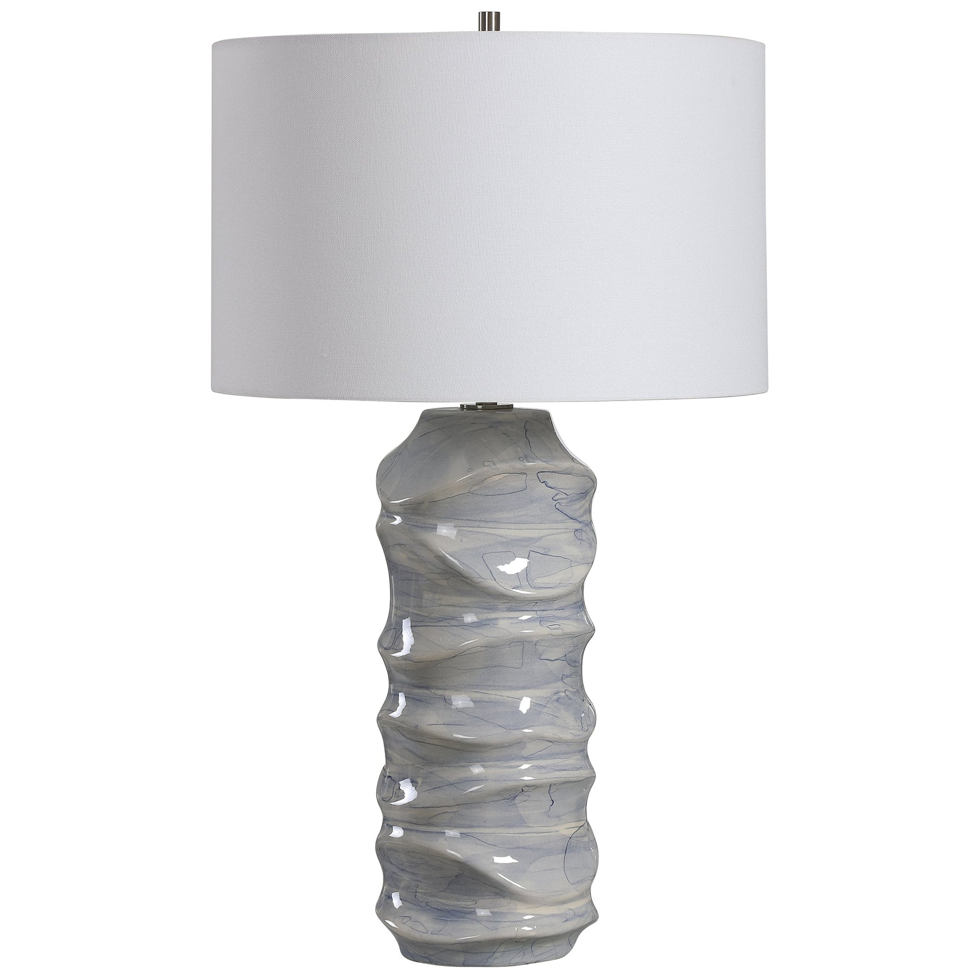 A Contemporary Take On Classic Blue And White Ceramics, This Table Lamp Features A Unique Sculpted Design With A Hand Applied Light Cobalt Blue Drip Glaze. The Lamp Is Paired With A Crisp White Hardback Drum Shade. Overall Depth : 16 in Overall Width : 16 in Overall Height : 27.5 in