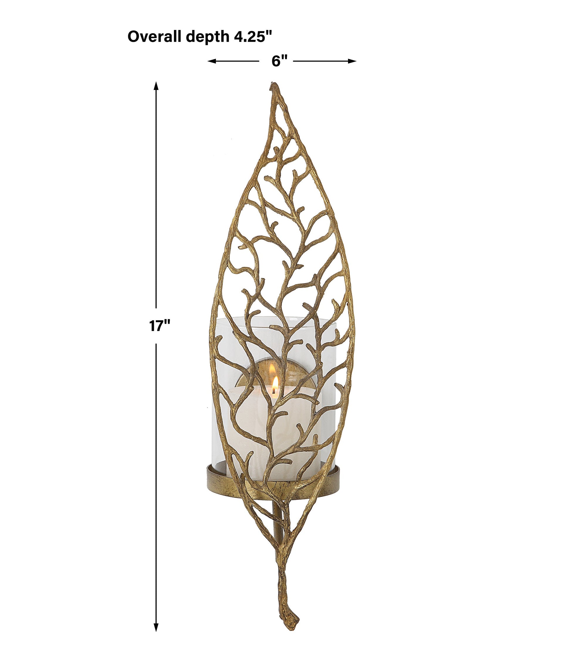 Echoing The Intricate Details Of Natural Flora, This Candle Sconce Is Crafted From Solid Brass With An Elegant Aged Gold Finish And Clear Glass Hurricane. One 3"x 3" Off White Distressed Candle Included. Overall Depth : 4.25 in Overall Width : 6 in Overall Height : 17 in