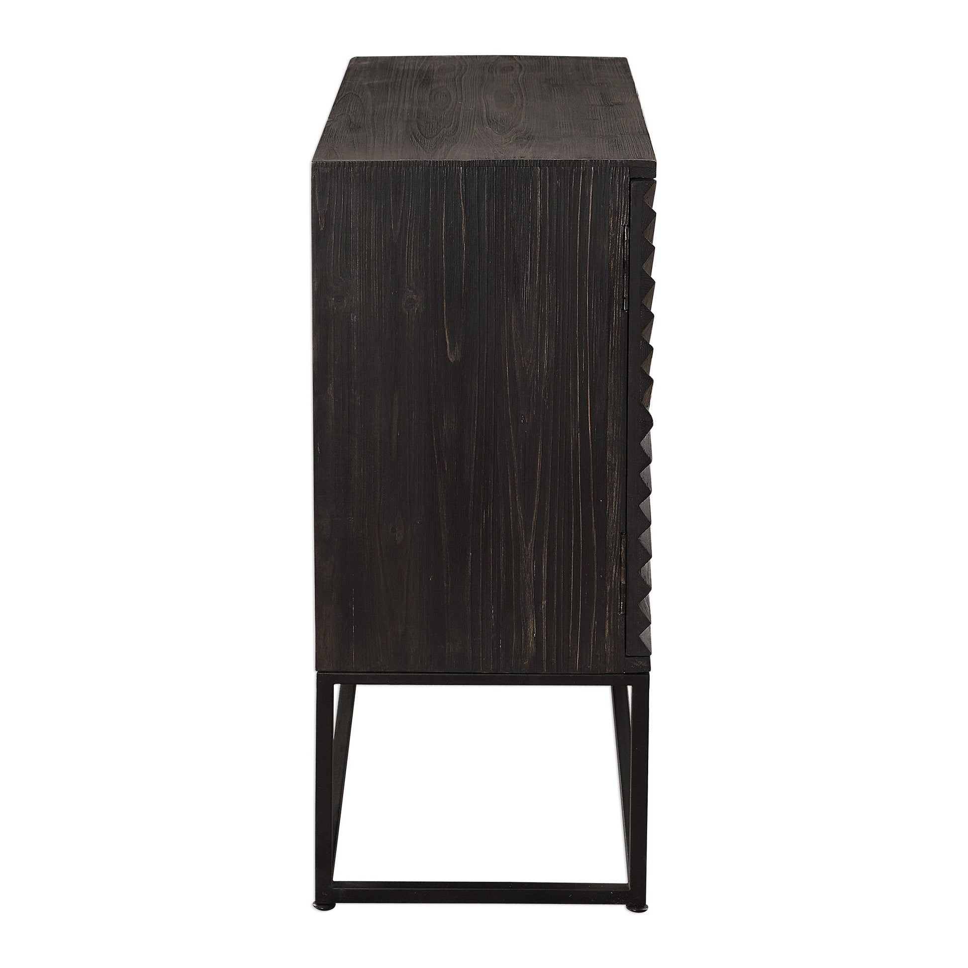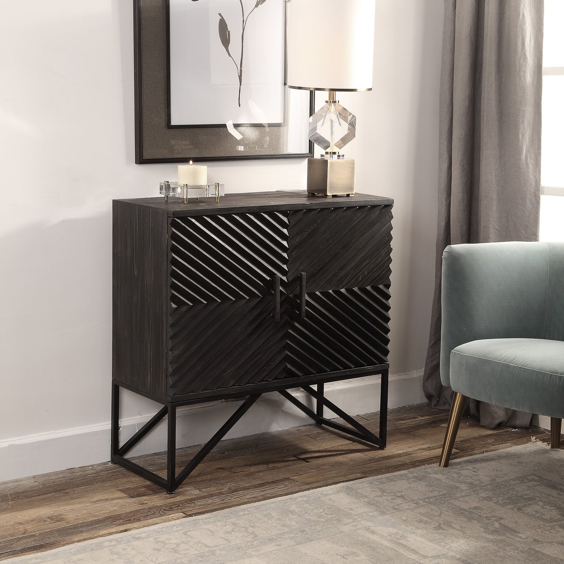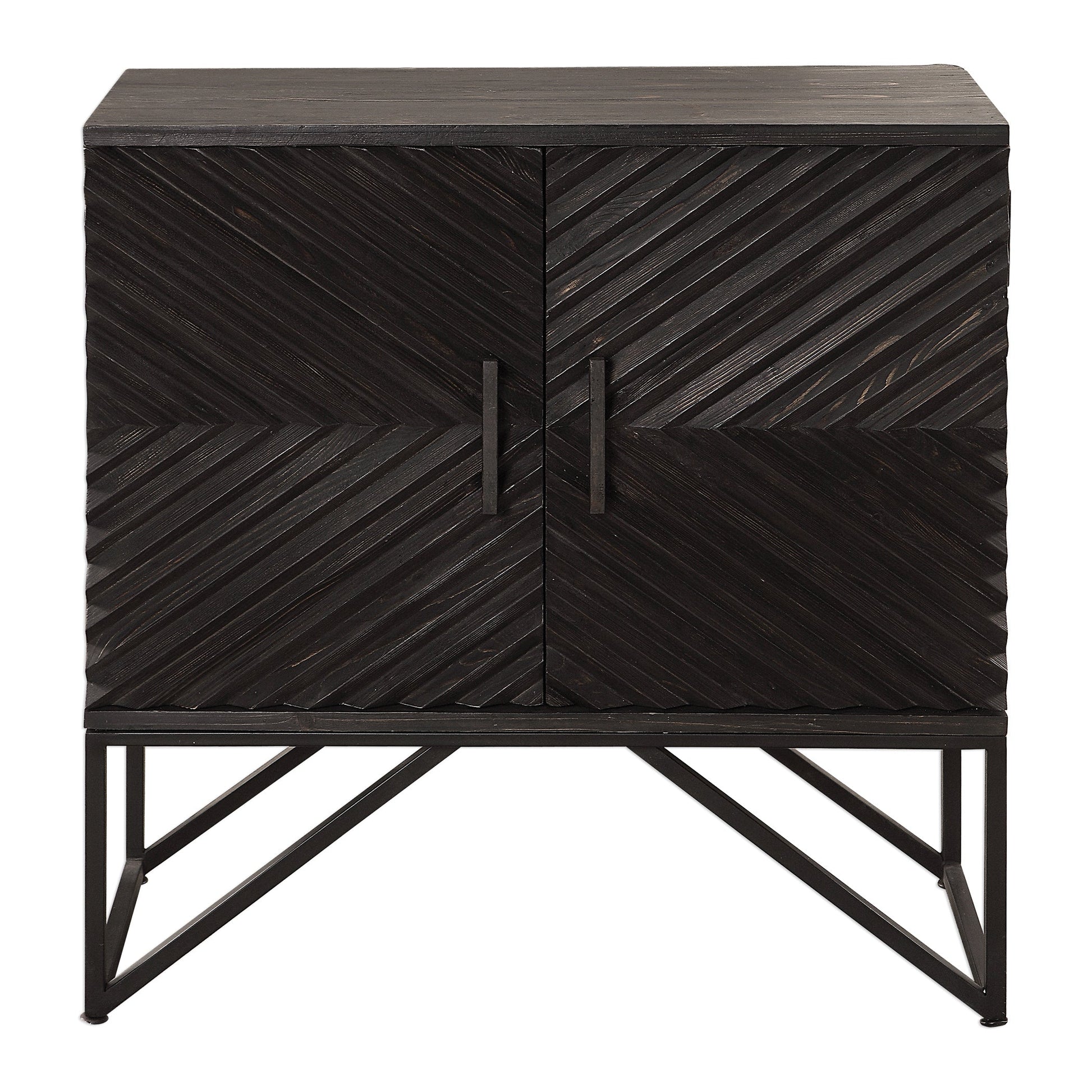 Intricately Pieced With A Modern 3-dimensional Book Matched Chevron Pattern In Aged Ebony Finished Fir Wood, Contrasting With A Naturally Finished Rustic Top. Supported By An Iron Base And Accented With Thick Iron Bar Hardware Finished In Black Steel. Has One Fixed Interior Shelf. Overall Depth : 16.5 in Overall Width : 36.2 in Overall Height : 36 in