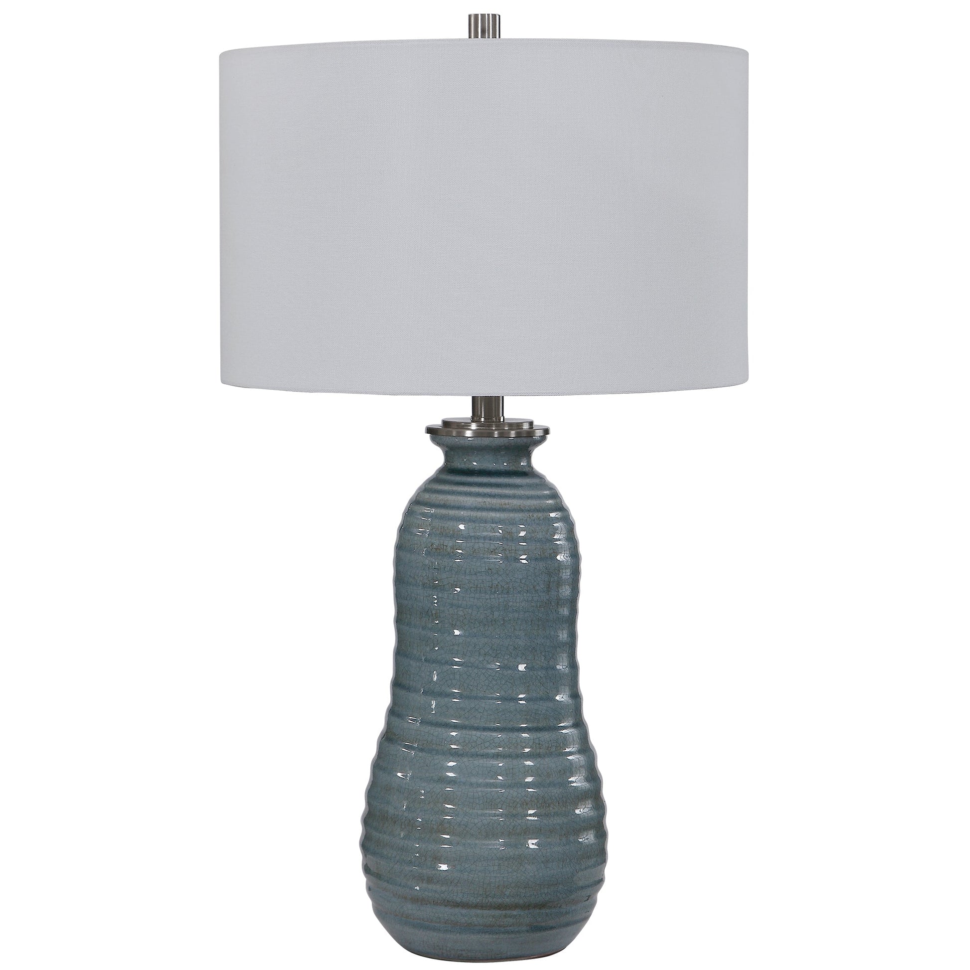 This Ceramic Table Lamp Has A Tapering Ribbed Surface That Is Finished In A Light Blue Crackled Glaze, Accented With Brushed Nickel Details. A Hardback Drum Shade In White Linen Complements This Piece. Due To The Nature Of Fired Glazes On Ceramic Lamps, Finishes Will Vary Slightly. Overall Depth : 16 in Overall Width : 16 in Overall Height : 28 in