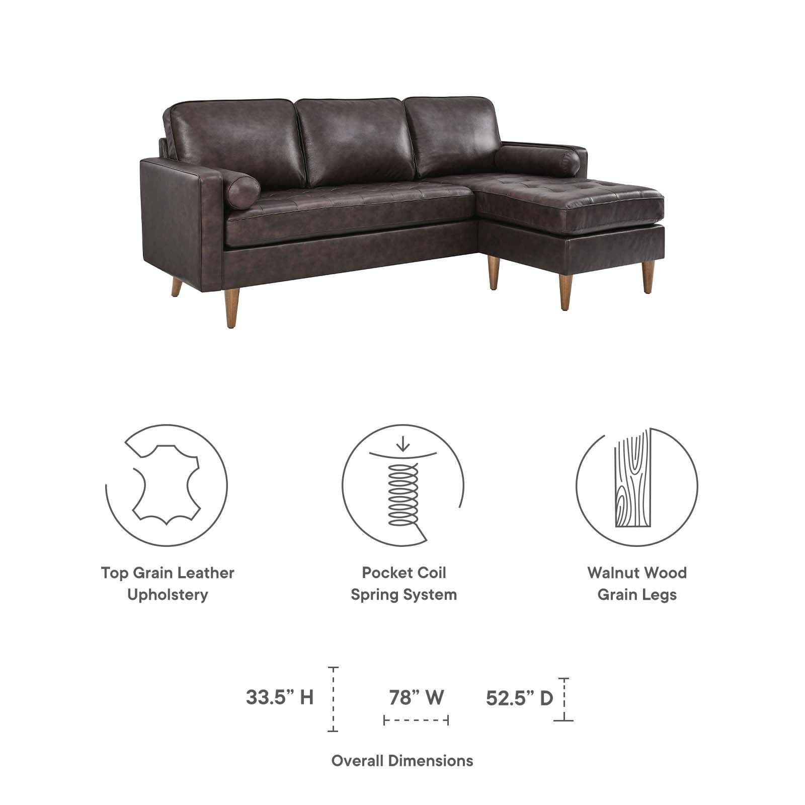 Update your home or apartment with the mid-century style and modern-day convenience of Valour. This comfortable apartment sectional sofa features a tailored profile with elegant biscuit tufting and two bolster pillows. The ottoman can be moved to either side of the 3-seater sofa, making this an interchangeable sectional. Covered in beautiful top grain leather upholstery, Valour has dense foam padding, an innerspring pocket structure, and sinuous spring support for a comprehensive seating experience. This luxe modern sectional sofa comes with walnut-stained wood legs with non-marking foot caps and supports up to 1322 lbs. Say goodbye to the days of hauling heavy furniture. This tufted sofa ships in a portable box for easy maneuvering.
