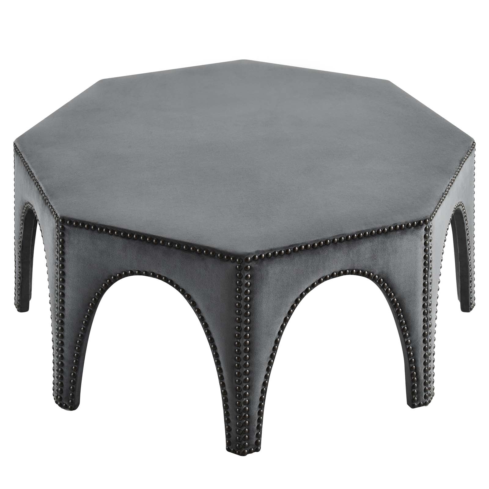 The Victory Nail Head Performance Velvet Ottoman is a refined accent piece complementing mid-century modern or eclectic settings. This elegantly structured eight-sided large ottoman features precise nailhead trim bordering the arches and along the edges. Foam padding throughout the piece enhances the crisp appearance and comfort of this mid-century ottoman. This ottoman also delivers comfortable living room seating with sturdy plywood construction and smartly upholstered in stain-resistant fabric. A versatile ottoman, Victory can also function as an extra seat or as a coffee table. This upholstered ottoman comes fitted with non-marking foot glides to protect your flooring. Weight Capacity: 331 lbs.