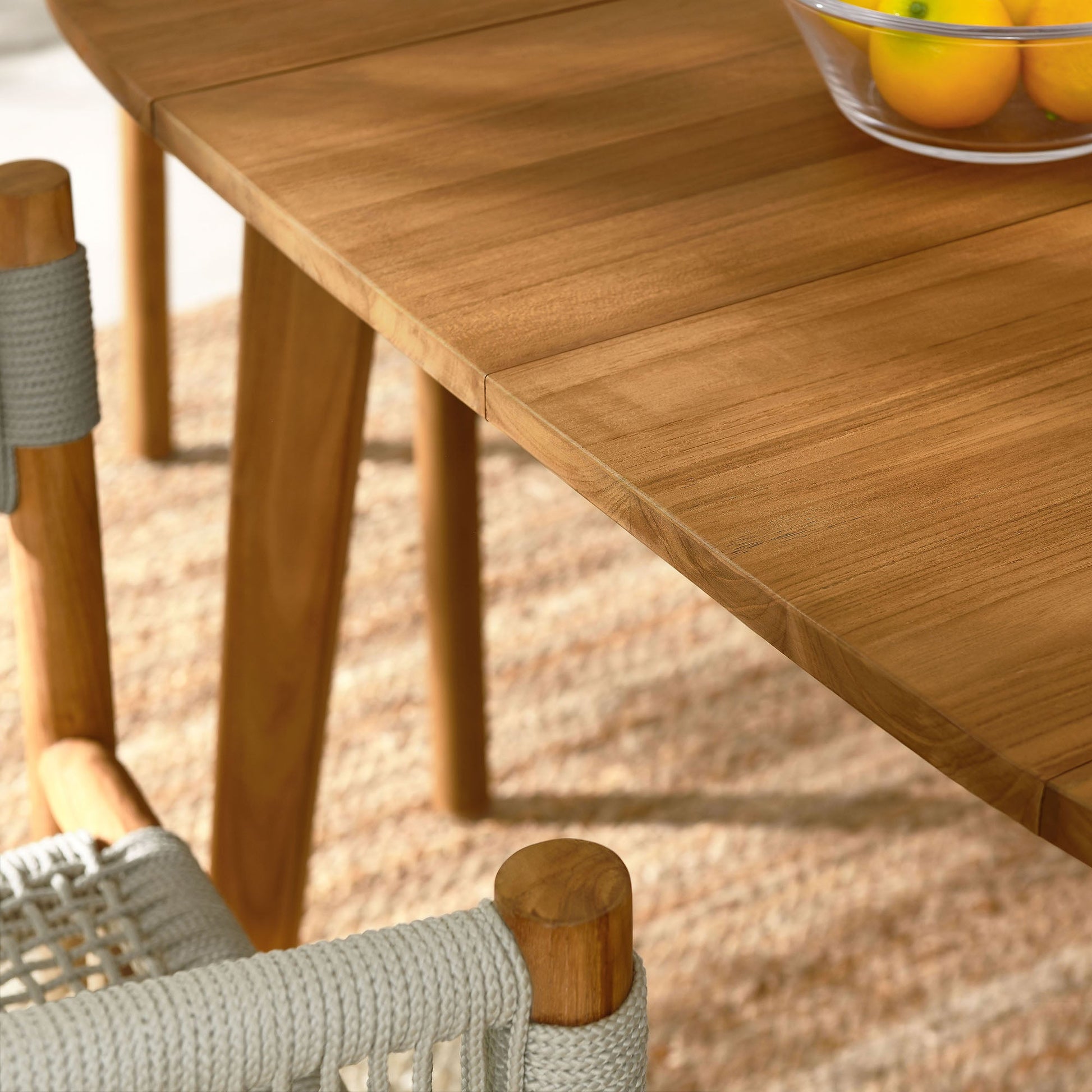 Refresh your outdoor dining experience with the 5-Piece Patio Dining Set. This modern outdoor patio set includes a solid teak wood square dining table and 4 foldable chairs, perfect for accommodating both casual meals and small gatherings. The naturally weather-resistant teak outdoor dining table features a slatted surface, enhancing its visual appeal and all-season durability. Add to that, the wood dining armchairs with curved open backs and seats woven with high-quality nylon rope, and this patio dining furniture set for 4 creates a contemporary and cohesive look ideal for any patio setting. Whether used on its own or mixed with other outdoor patio furniture, this 5-piece outdoor dining set blends effortlessly in your al fresco space. Assembly required. Overall Product Dimensions: 94.86"L x 94.62"W x 29.72"H