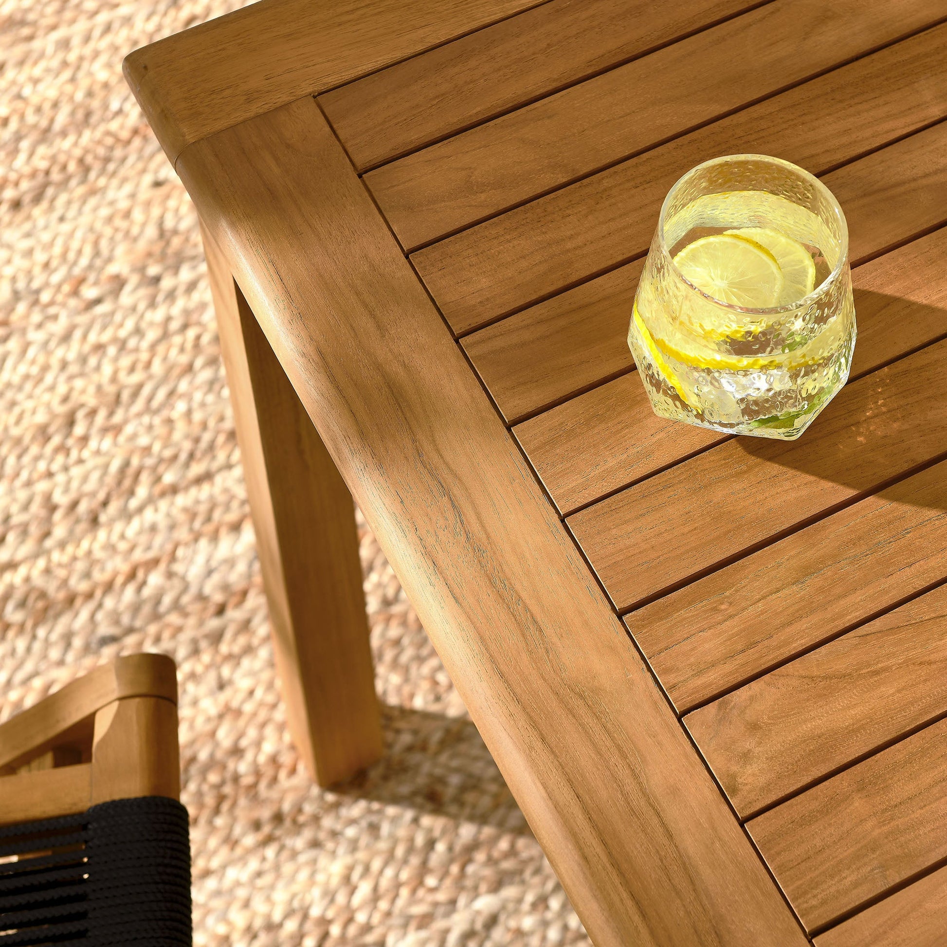 Refresh your outdoor dining experience with the 5-Piece Outdoor Patio Dining Set. This modern outdoor patio set includes a solid teak wood square dining table and 4 foldable chairs, perfect for accommodating both casual meals and small gatherings. The naturally weather-resistant teak outdoor dining table features a slatted surface, enhancing its visual appeal and durability. The foldable teak chairs offer convenience and ease of storage without sacrificing style or comfort. With seats woven in high-quality nylon rope, these armless chairs contribute to a contemporary and cohesive look, making this patio dining furniture set for 4 well suited for long, relaxing evenings. Whether used on its own or mixed with other outdoor patio furniture, this 5-piece outdoor dining set blends effortlessly, complementing a diverse range of garden, porch, and patio settings. Assembly required. Overall Product Dimensions: 80.05"L x 80.05"W x 35.24"H