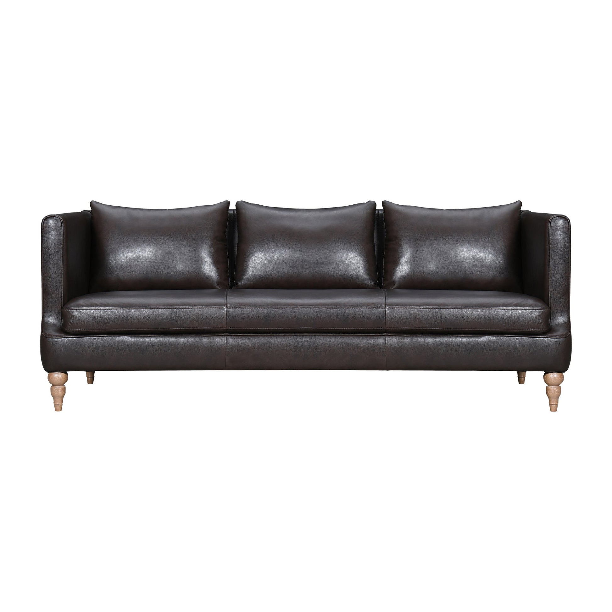 Invite luxury into your home with the Vincenza 85" Leather Upholstered Sofa from Armen Living – where classic elegance meets modern comfort. This sofa is meticulously designed to be the centerpiece of your living space, offering a perfect blend of timeless style and modern comfort. This couch boasts sumptuous leather upholstery that epitomizes chic durability. Available in both soothing Dove Gray and rich Dark Brown leather options, this upholstery adds a touch of sophistication that can effortlessly complement any interior decor. Crafted with precision, the Vincenza features a sleek square frame and elegant turned wood legs. These design elements not only enhance the visual appeal but also provide sturdy support. The squared edges and turned legs create an aesthetic that seamlessly marries traditional and modern design. With an accommodating 85-inch width, our grey or brown sofa comfortably seats up to three individuals. Whether you're hosting a movie night, entertaining guests, or simply unwinding after a long day, this sofa offers an ample seating area for everyone to relax in style. The plush cushions and soft leather upholstery ensure that you and your guests enjoy the ultimate in comfort. The Vincenza features durable seat construction, the sinuous springs are strategically placed to offer consistent and comfortable seating. Say goodbye to uncomfortable sags or uneven cushioning. The Vincenza sofa is available in dove gray or dark brown leather upholstery.