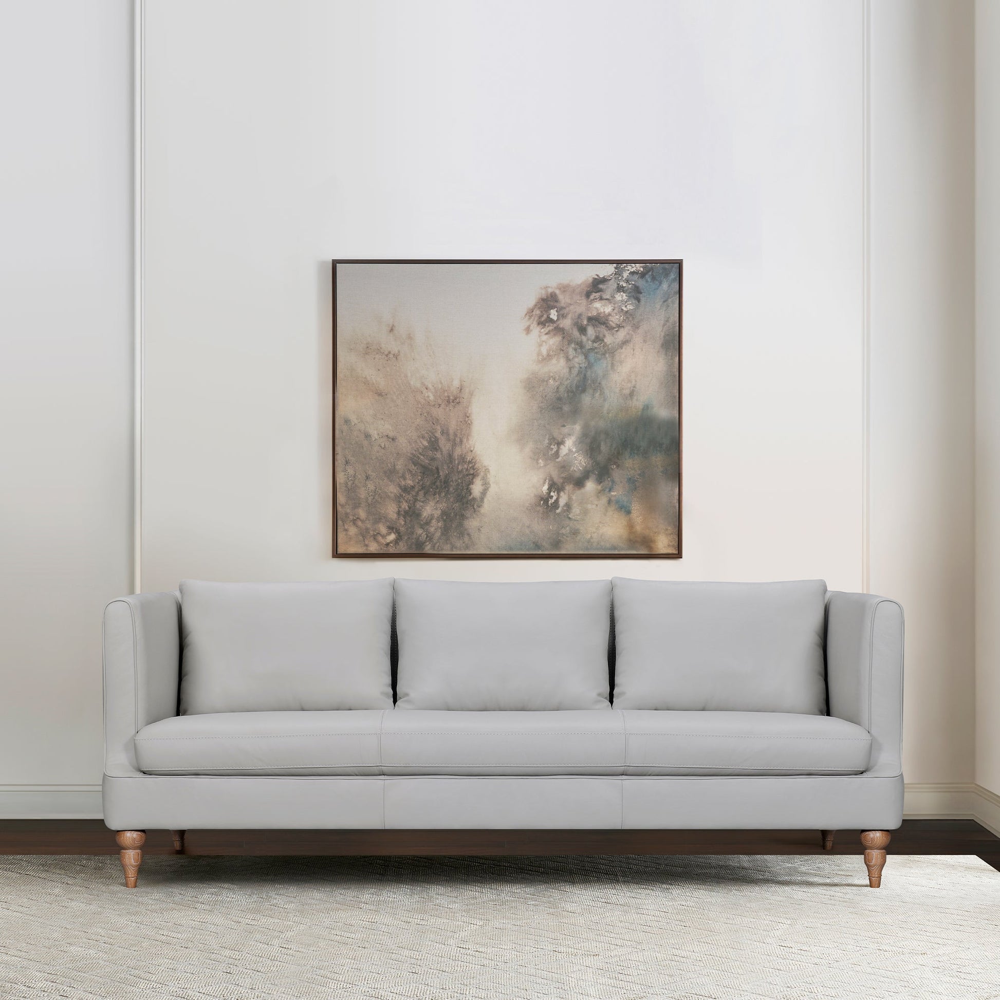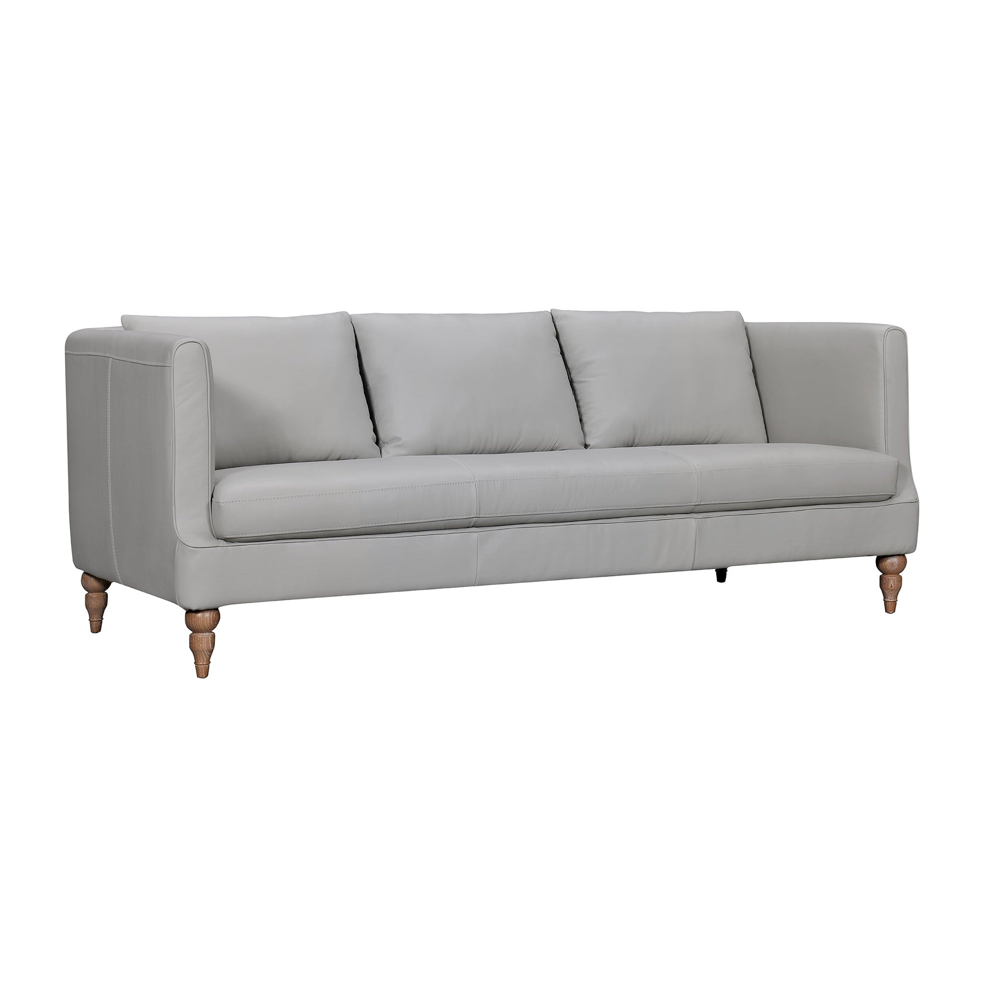 Invite luxury into your home with the Vincenza 85" Leather Upholstered Sofa from Armen Living – where classic elegance meets modern comfort. This sofa is meticulously designed to be the centerpiece of your living space, offering a perfect blend of timeless style and modern comfort. This couch boasts sumptuous leather upholstery that epitomizes chic durability. Available in both soothing Dove Grey and rich Dark Brown leather options, this upholstery adds a touch of sophistication that can effortlessly complement any interior decor. Crafted with precision, the Vincenza features a sleek square frame and elegant turned wood legs. These design elements not only enhance the visual appeal but also provide sturdy support. The squared edges and turned legs create an aesthetic that seamlessly marries traditional and modern design. With an accommodating 85-inch width, our grey or brown sofa comfortably seats up to three individuals. Whether you're hosting a movie night, entertaining guests, or simply unwinding after a long day, this sofa offers an ample seating area for everyone to relax in style. The plush cushions and soft leather upholstery ensure that you and your guests enjoy the ultimate in comfort. The Vincenza features durable seat construction, the sinuous springs are strategically placed to offer consistent and comfortable seating. Say goodbye to uncomfortable sags or uneven cushioning. The Vincenza sofa is available in dove gray or dark brown leather upholstery.