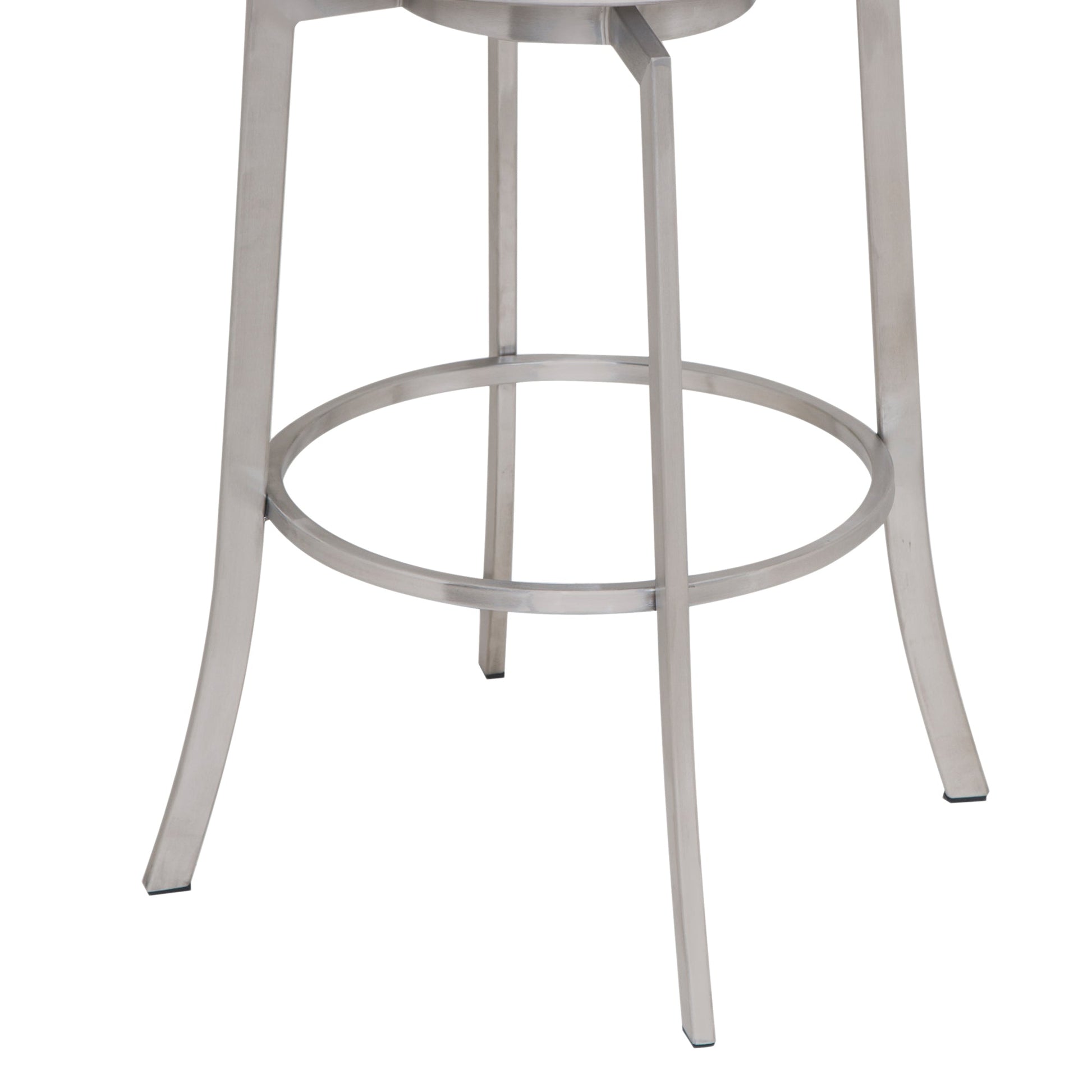 The Viper 26" Swivel White Faux Leather and Brushed Stainless Steel Counter Stool from Armen Living is the perfect addition to any home or apartment. The 360-degree swivel motion allows you to stay engaged with your guests regardless of their place in the room at parties or gatherings. The Viper’s armless design easily allows you to use this stool at your kitchen island, peninsula counter, or home bar. The high-density foam cushion is wrapped in soft faux leather, and this makes for easy clean up, while the ring footrest keeps your feet elevated further adding to your overall comfort. The seat back is rounded to provide extra lumbar support and displays a modern windowpane design. The Viper’s flared legs make for a beautiful silhouette that helps this unique stool become a statement piece in your home. This kitchen stool is constructed of high-quality materials and will last for many years to come. The Viper counter or bar stool is available in your choice of gray, white, or black faux leather upholstery and comes in a brushed stainless-steel finish and comes in 26” or 30” seat heights.