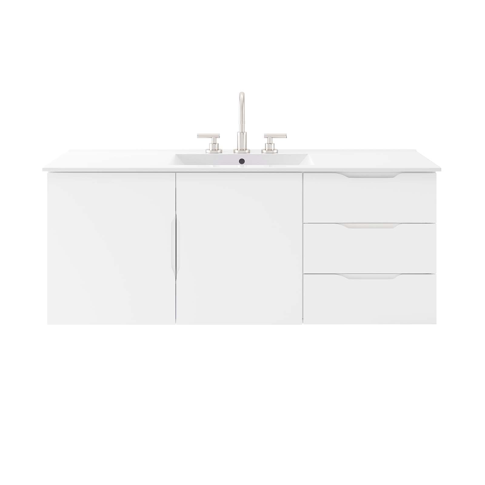 Energize your bathroom space with the modern design of the Vitality 48" Wall-Mount Bathroom Vanity. Boasting a sleek, clean-lined silhouette, this vanity is durably crafted with particleboard and MDF with a melamine finish. This vanity features a wall-mount design and is complete with ample storage space for all your bathroom essentials with two spacious drawers and an under-sink storage area behind two soft-close doors. This vanity is complete with a ceramic sink basin with 8-inch centerset holes and an integrated countertop. This vanity boasts an open back to accommodate plumbing. Fixtures not included. Assembly required.