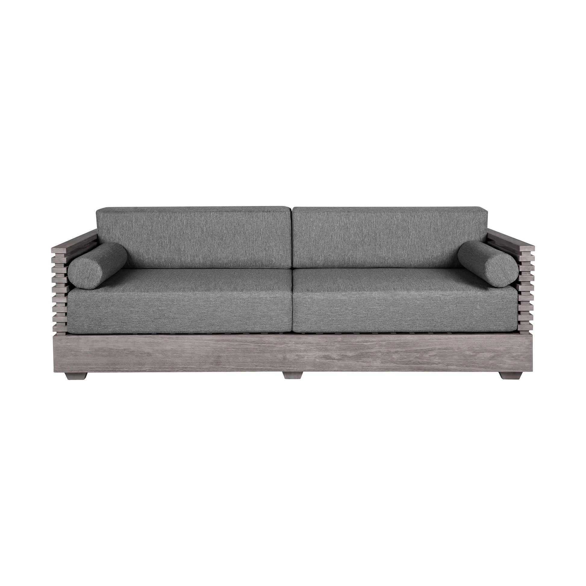 Introducing the Vivid Outdoor Patio Sofa, a perfect blend of style and functionality designed to elevate your outdoor living space. This sophisticated outdoor sofa in a timeless gray hue is crafted from durable Eucalyptus wood, seamlessly combining aesthetics with longevity. Designed for the outdoor enthusiast, the Vivid Outdoor Patio Sofa is not only adds a touch of elegance but also ensures the sofa's durability, making it a reliable choice for your outdoor seating needs. The water-resistant and UV-resistant features of this outdoor sofa make it a resilient option against the elements, allowing you to enjoy its comfort and style in various weather conditions. The included gray Olefin cushions provide an extra layer of comfort and are easily removable by the zipper closure for convenient cleaning, ensuring your outdoor oasis remains fresh and inviting. Whether you're hosting a gathering or enjoying a quiet evening under the stars, the Vivid Outdoor Patio Sofa provides a comfortable and stylish seating solution. Its versatile design seamlessly complements any outdoor setting, making it an ideal choice for your patio, garden, or poolside area. Invest in quality outdoor furniture that stands the test of time, and choose the Vivid Outdoor Patio Sofa. With its durable Eucalyptus wood construction, water-resistant and UV-resistant features, and easy-to-clean removable cushion covers, this outdoor sofa is not just a piece of furniture; it's a statement of style and practicality for your outdoor sanctuary. This sofa includes 2 bolster pillows, 2 back cushions, and 2 seat cushions that attach with hook and loop straps.