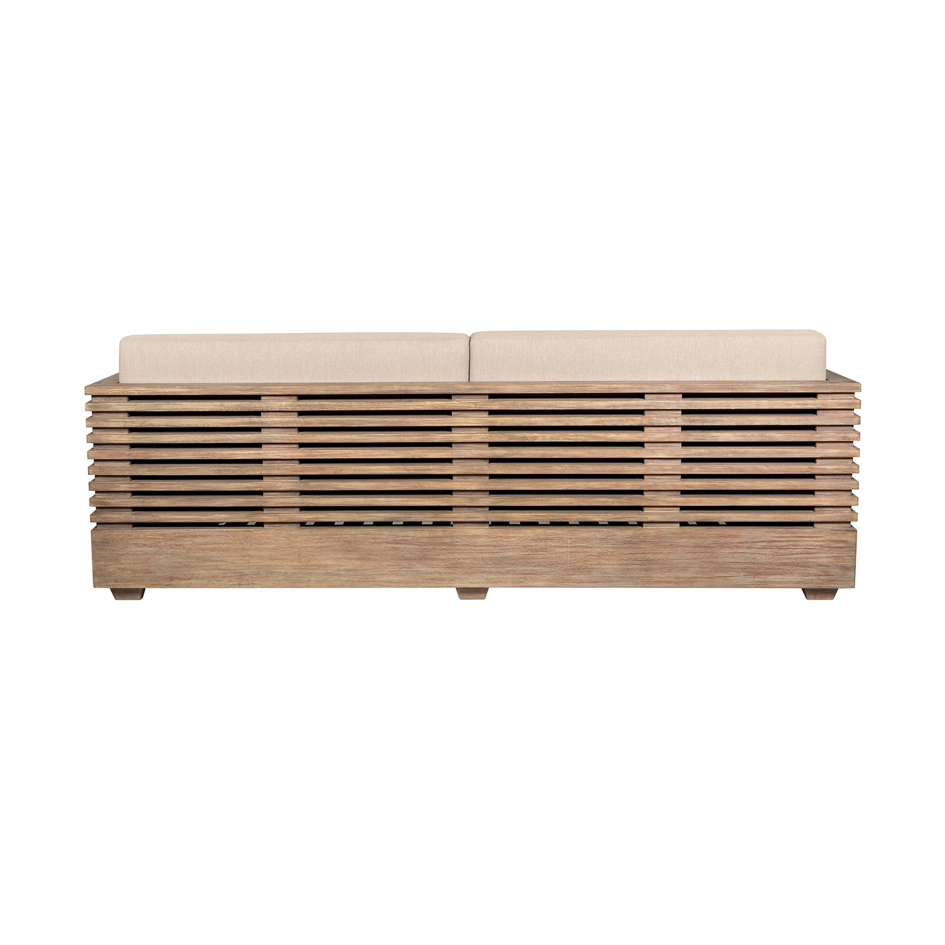 Introducing the Vivid Outdoor Patio Sofa, a perfect blend of style and functionality designed to elevate your outdoor living space. This sophisticated outdoor sofa in a timeless taupe hue is crafted from durable Eucalyptus wood, seamlessly combining aesthetics with longevity. Designed for the outdoor enthusiast, the Vivid Outdoor Patio Sofa is not only adds a touch of elegance but also ensures the sofa's durability, making it a reliable choice for your outdoor seating needs. The water-resistant and UV-resistant features of this outdoor sofa make it a resilient option against the elements, allowing you to enjoy its comfort and style in various weather conditions. The included taupe Olefin cushions provide an extra layer of comfort and are easily removable by the zipper closure for convenient cleaning, ensuring your outdoor oasis remains fresh and inviting. Whether you're hosting a gathering or enjoying a quiet evening under the stars, the Vivid Outdoor Patio Sofa provides a comfortable and stylish seating solution. Its versatile design seamlessly complements any outdoor setting, making it an ideal choice for your patio, garden, or poolside area. Invest in quality outdoor furniture that stands the test of time, and choose the Vivid Outdoor Patio Sofa. With its durable Eucalyptus wood construction, water-resistant and UV-resistant features, and easy-to-clean removable cushion covers, this outdoor sofa is not just a piece of furniture; it's a statement of style and practicality for your outdoor sanctuary. This sofa includes 2 bolster pillows, 2 back cushions, and 2 seat cushions that attach with hook and loop straps.