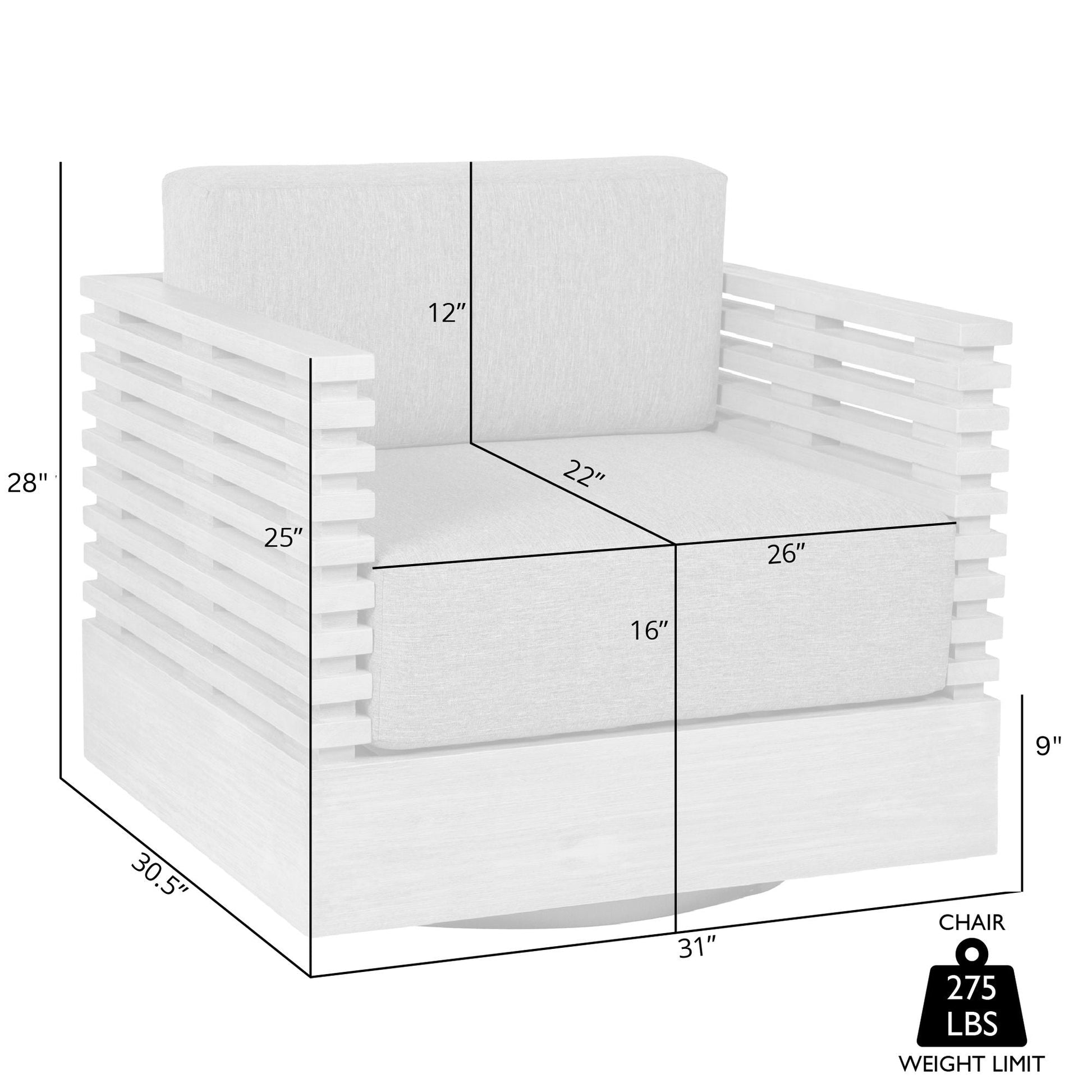 Introducing the Vivid Swivel Outdoor Patio Chair – a perfect marriage of comfort, style, and functionality designed to elevate your outdoor lounging experience. Crafted with meticulous attention to detail, this swivel chair is a testament to the seamless integration of form and function, providing a luxurious addition to your patio or outdoor setting. The chair's frame, constructed from durable Eucalyptus wood, adds a touch of sophistication to your outdoor space. The timeless beauty of Eucalyptus wood ensures not only visual appeal but also long-lasting resilience, making the Vivid Swivel Outdoor Patio Chair a standout piece of outdoor furniture. Designed for those who appreciate both aesthetics and durability, this chair boasts water-resistant and UV-resistant features, allowing it to withstand the elements with grace. Whether positioned under the sun or facing unexpected rain, the Vivid Swivel Outdoor Patio Chair remains a steadfast companion for your outdoor moments. Immerse yourself in relaxation with the plush Olefin cushions that adorn this swivel chair. The gray cushions not only provide a comfortable seat but also add a touch of elegance to the overall design. With water-resistant capabilities and easily removable covers, maintaining the freshness and allure of your outdoor oasis has never been easier. Versatile and inviting, the Vivid Swivel Outdoor Patio Chair effortlessly enhances any outdoor environment, from a tranquil garden retreat to a lively patio setting. The swivel feature adds a dynamic element, allowing you to effortlessly turn and take in your surroundings, making it a perfect choice for those seeking both comfort and engagement in their outdoor space. Invest in outdoor furniture that blends style and functionality seamlessly, and choose the Vivid Swivel Outdoor Patio Chair in Eucalyptus Wood with Olefin Cushions.