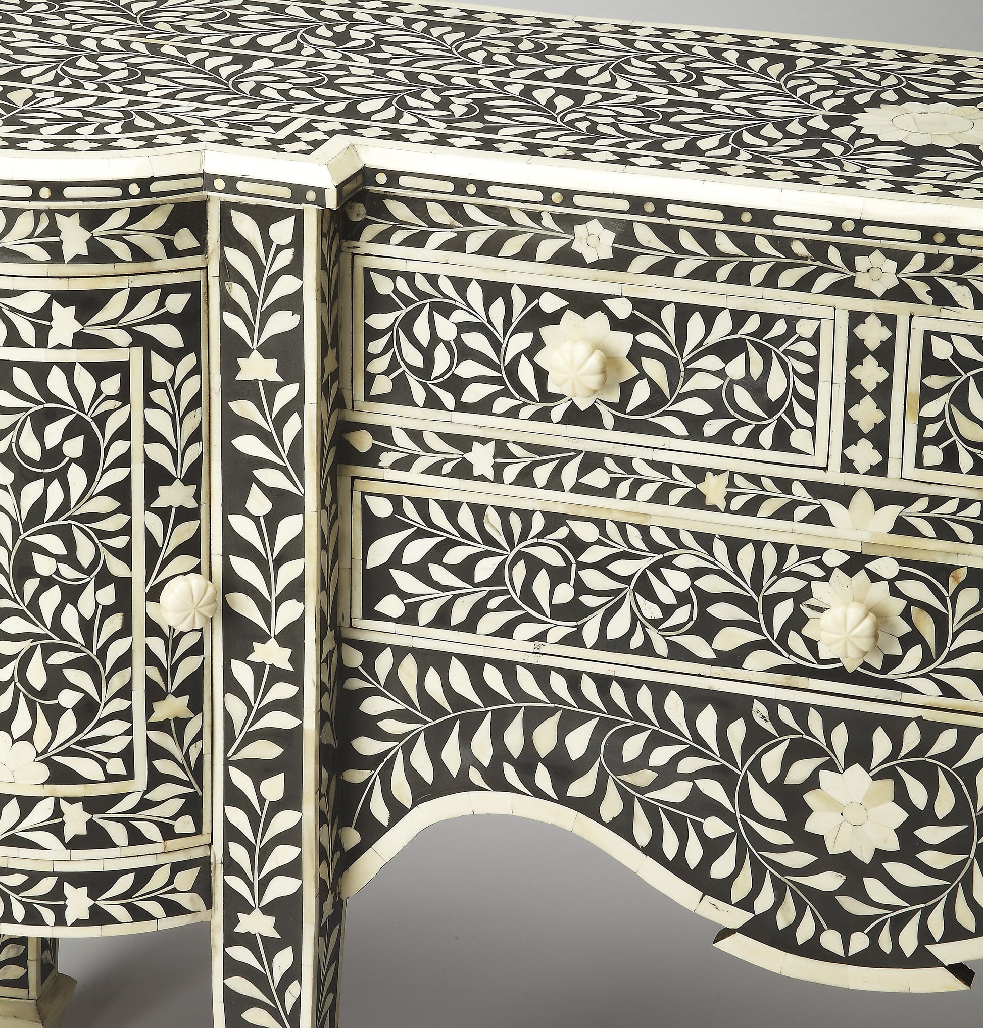 This magnificent Buffet features sophisticated artistry and craftsmansip. The botanic patterns covering the piece are bone inlays formed and applied individually by the hands of a consummate artisan. No two pieces are ever exactly alike, ensuring this Buffet is a bonafide orginal. Dimensions: 57.25"W x 18"D x 33.5"H