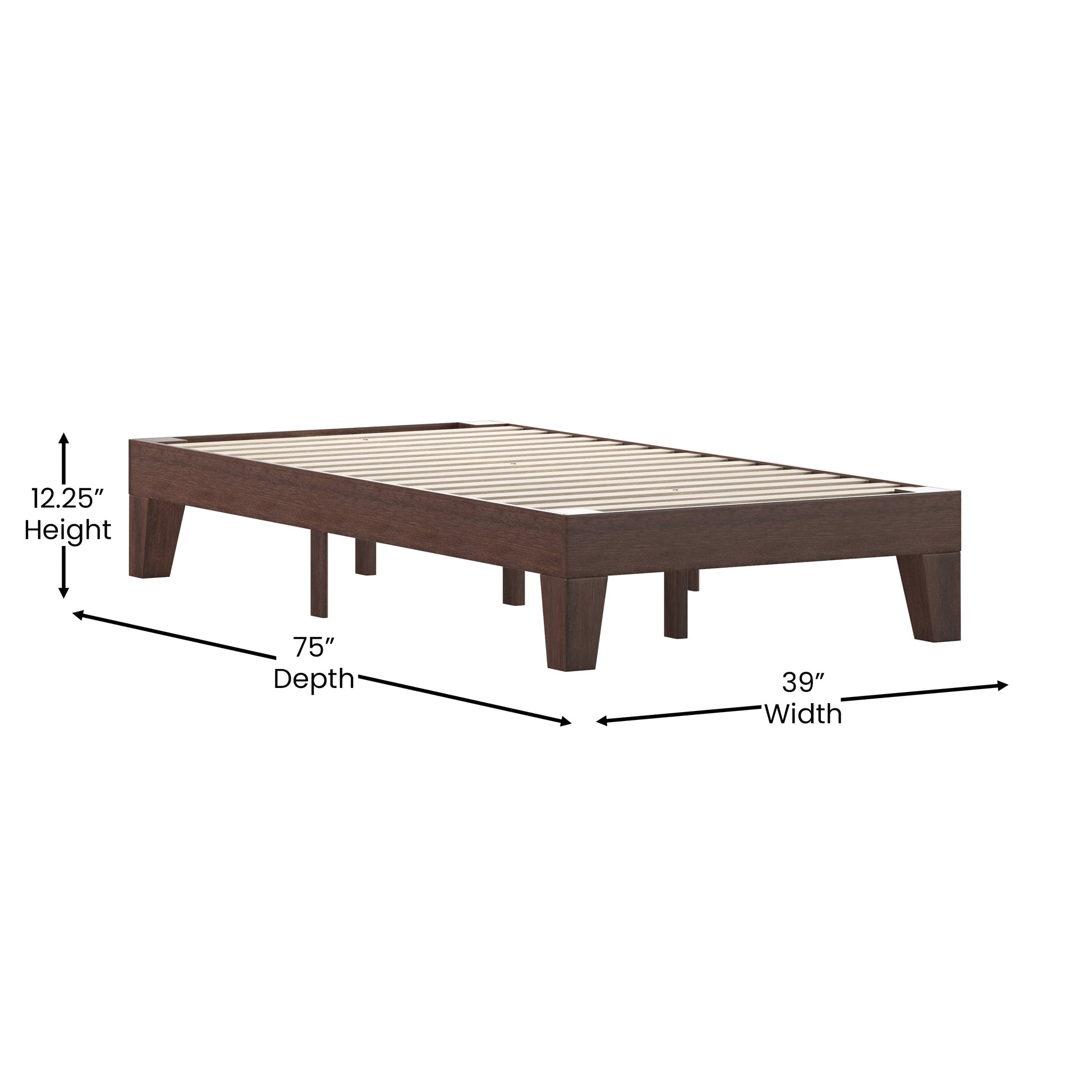 Evelyn Walnut Finish Wood Twin Platform Bed with Wooden Support Slats, No Box Spring Required Dimensions: 39"W x 75"D x 12.25"H
