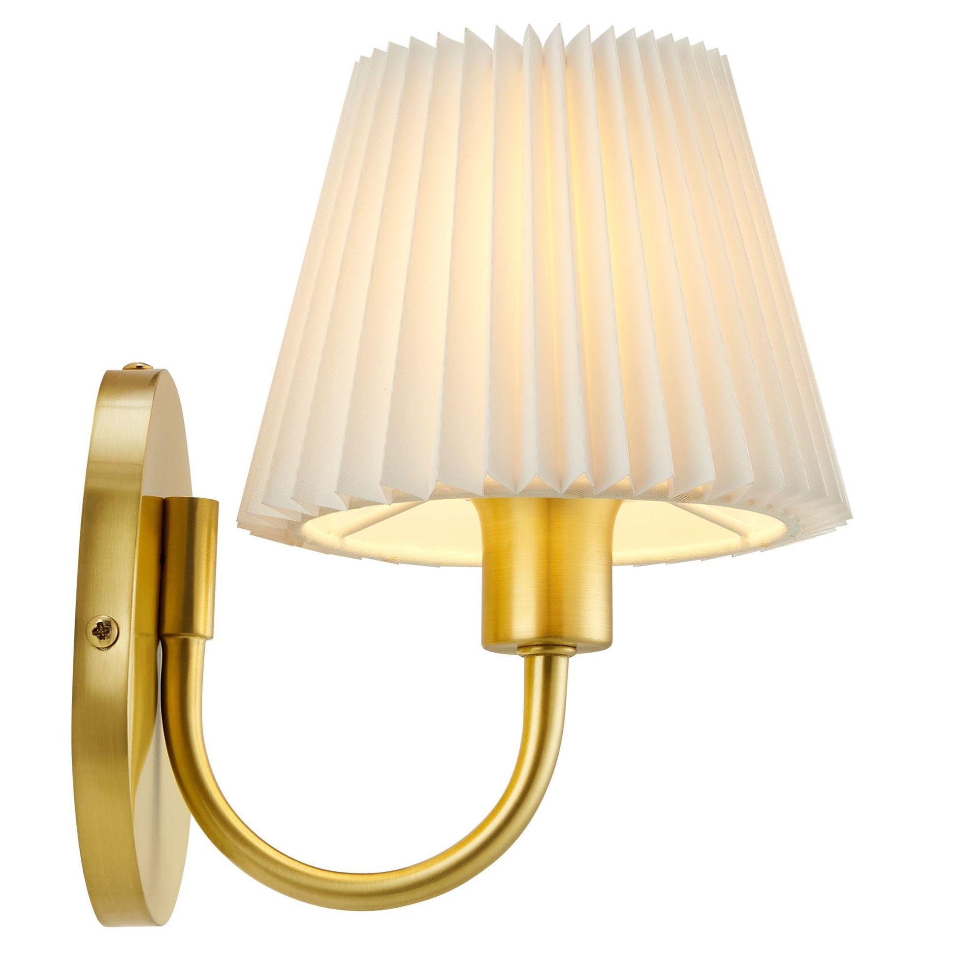 Merging contemporary design with timeless elegance, the Wave Wall Sconce features a graceful U-shaped metal arm that evokes a sense of balance and symmetry. This fixed arm, crafted from durable metal, upholds a pleated fabric shade that diffuses light into a warm, inviting glow. This wall sconce is ideal as a bedside reading lamp or as a refined accent light in a modern living room. The sconce's hardwired construction ensures a seamless integration into your space, complemented by a round metal backplate that adds a sleek touch to the overall design. Embrace both form and function with this single sconce, a modern wall light that makes a striking statement. This wall-mounted lamp is ETL listed and approved and requires a single E12 25W bulb (not included). Assembly required. Overall Product Dimensions: 7.5"L x 6.1"W x 8.7"H