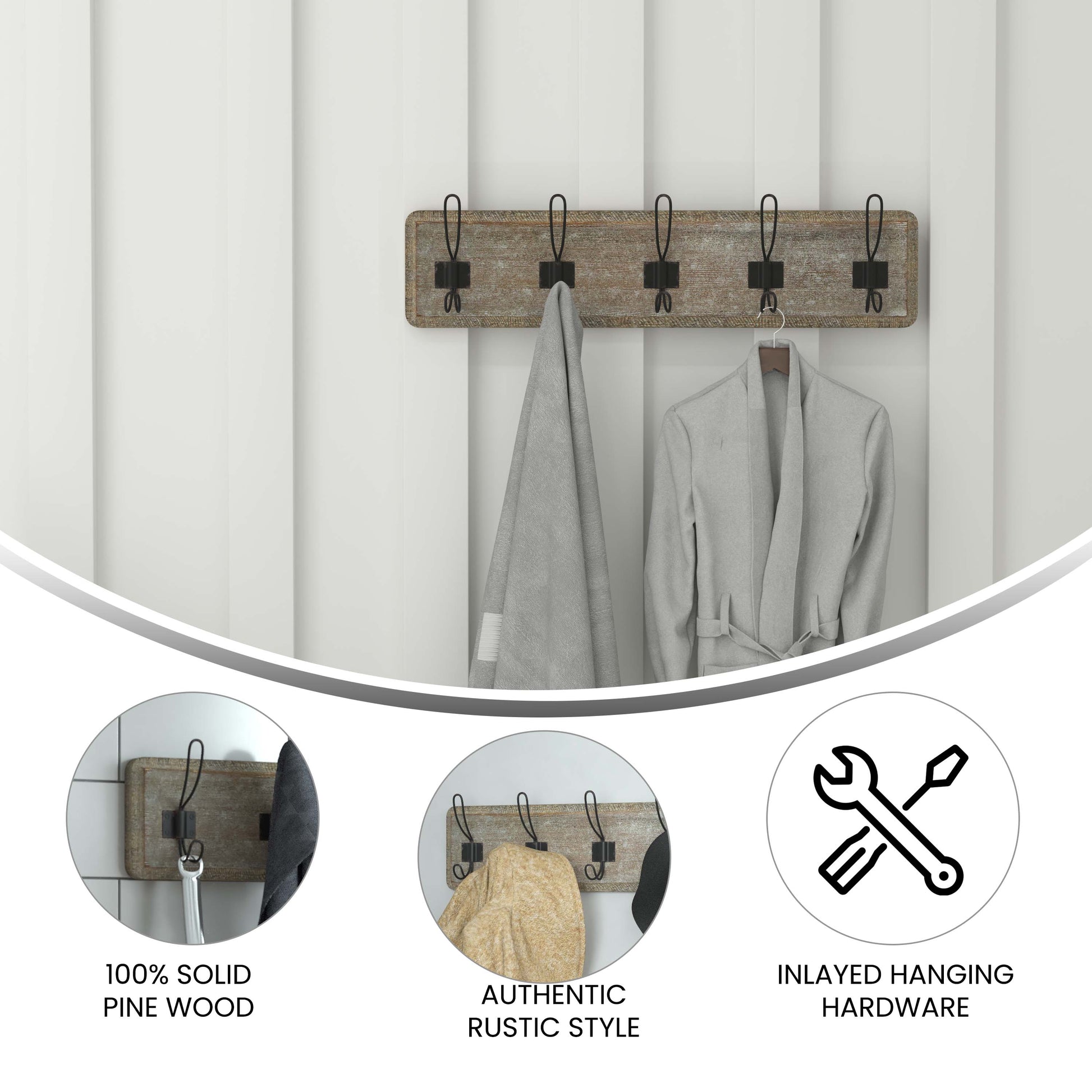 Daly Wall Mounted 24 Inch Weathered Solid Pine Wood Storage Rack with 5 Hooks For Entryway, Kitchen, Bathroom Dimensions: 24"W x 3.1"D x 6.5"H