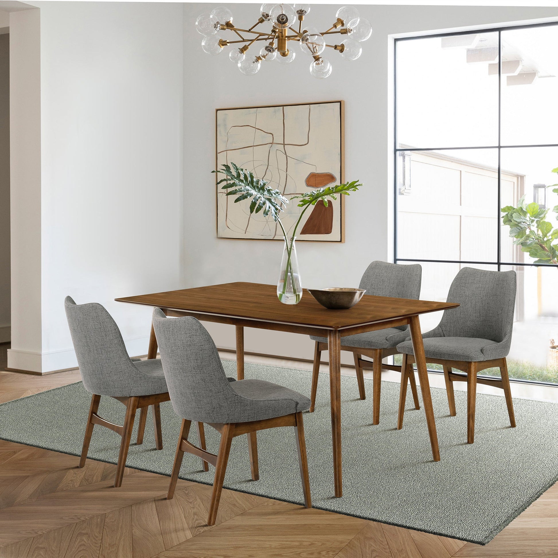 The Westmont and Azalea Charcoal and Walnut 5 Piece Dining Set is designed with clean and simple lines and is a great selection for your dining room or kitchen breakfast nook. The simple elegance of this dining set will make everyday meals special. This dining set ensures a set of excellent durability and long service life. In addition, the dining set's smooth surface makes it easy to clean. It is also easy to assemble. The soft fabric upholstery of the Azalea chair is luxuriously wrapped around the entire seat - covering the ultra-comfortable foam padded cushion. Featuring a wide back and spacious seat, you never have to feel confined to a small space. The clean, sleek, and geometric wooden legs add a modern style to this chair - also assuring dependability that this chair will last and give you years of enjoyment. The Westmont and Azalea Wood 5 Piece Dining Set is available in your choice of a Black wood finish with Gray upholstery or a Walnut wood finish with Blue, Charcoal or Orange upholstery.