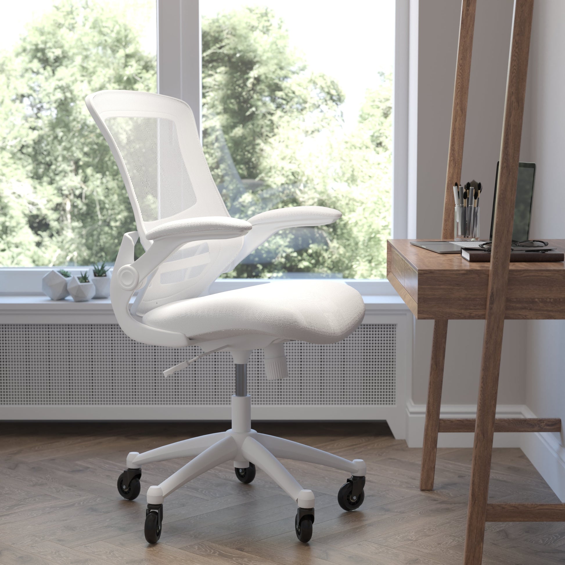 Kelista Mid-Back White Mesh Swivel Ergonomic Task Office Chair with White Frame, Flip-Up Arms, and Transparent Roller Wheels Dimensions: 24.5"W x 25.5"D x 37.5" - 41.25"H