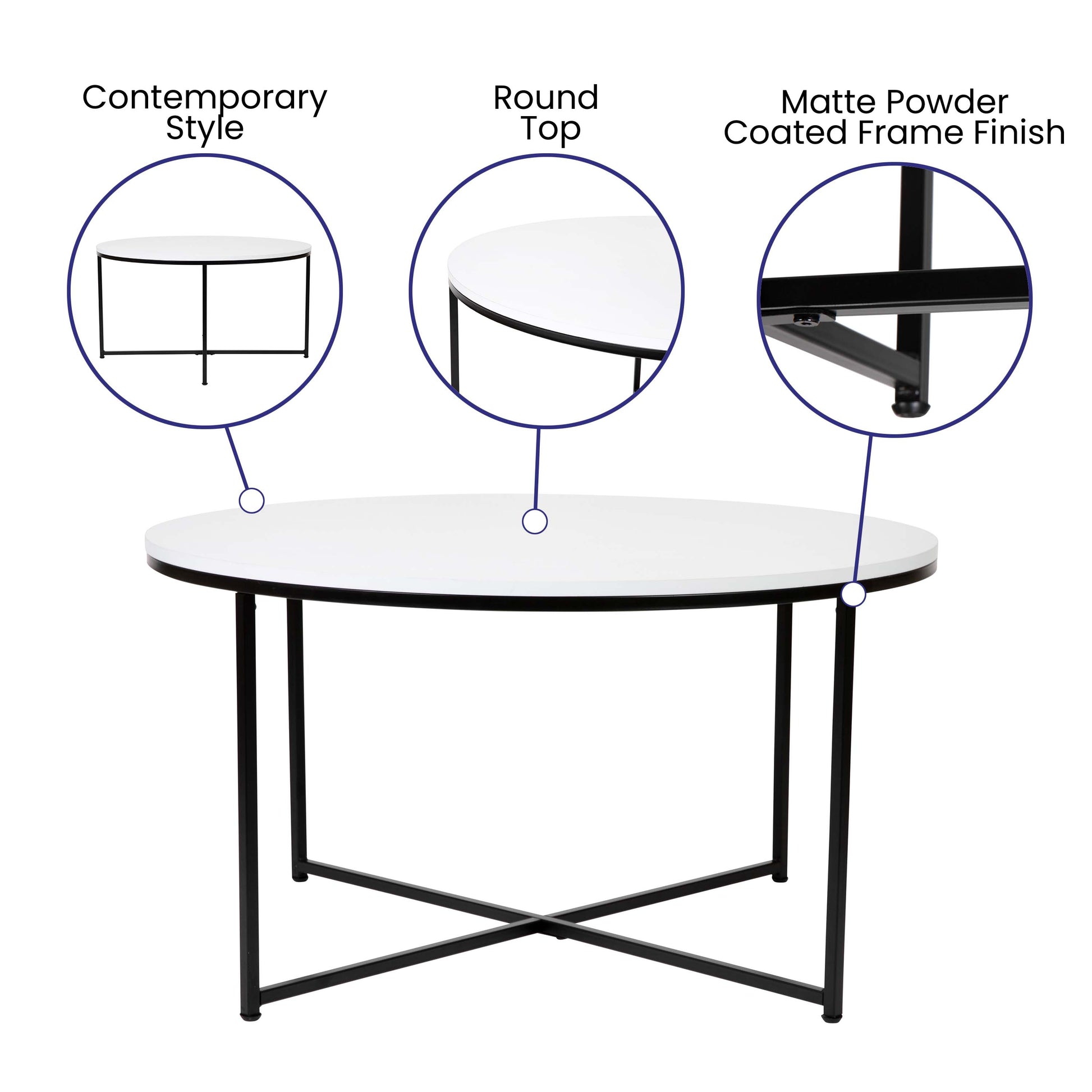 Hampstead Collection Coffee Table - Modern White Finish Accent Table with Crisscross Matte Black Frame Dimensions: 35.5"W x 35.5"D x 19.25"H