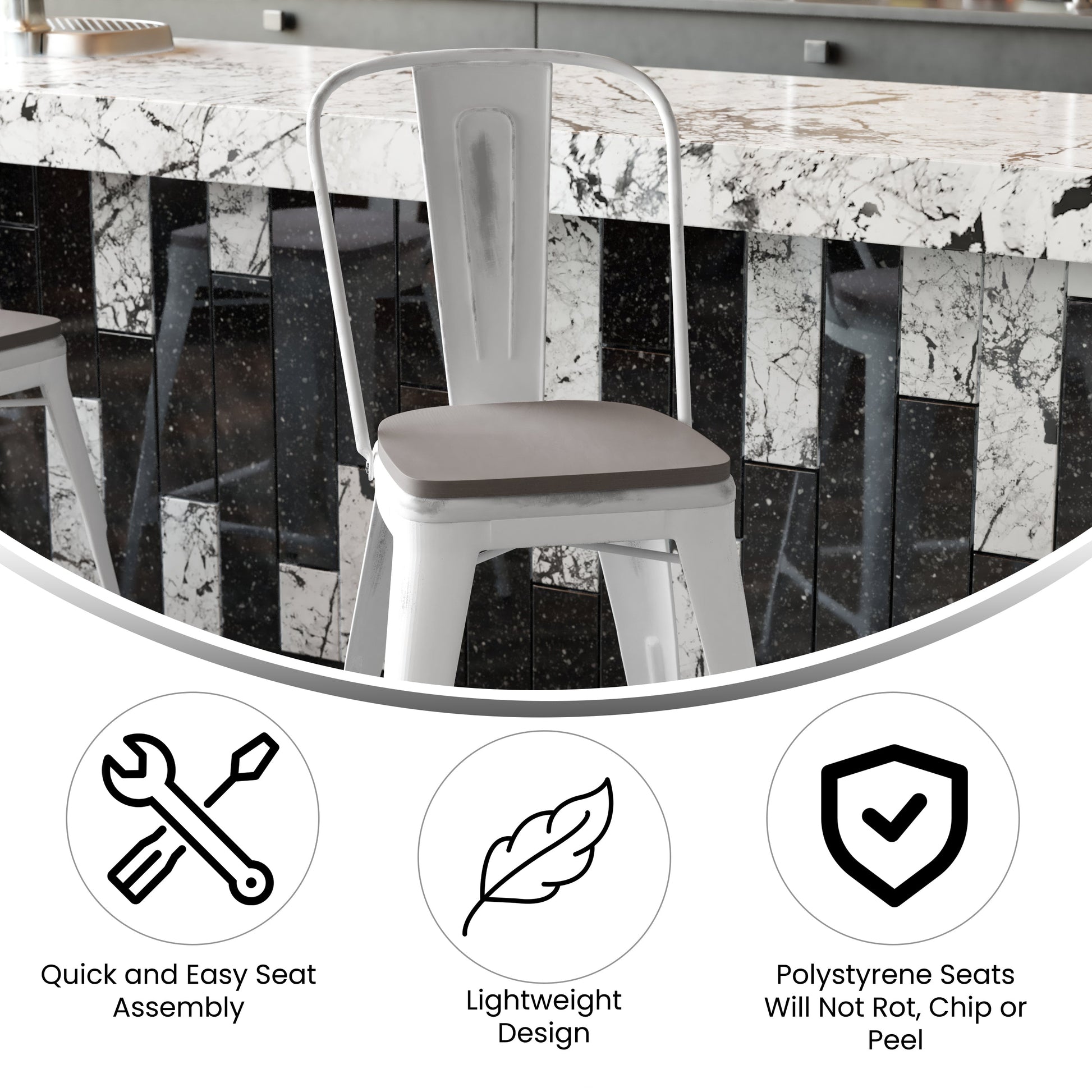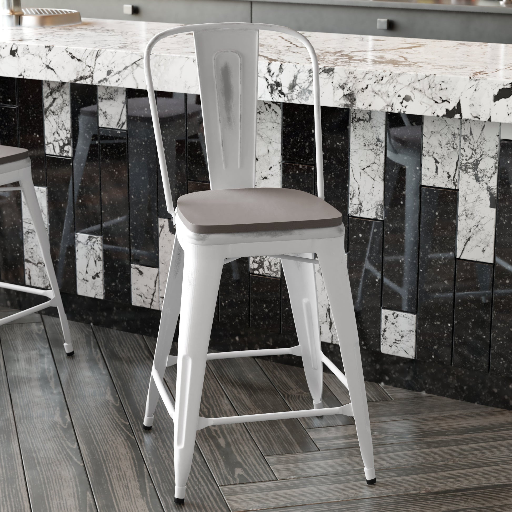Carly Commercial Grade 24" High White Metal Indoor-Outdoor Counter Height Stool with Back with Gray Poly Resin Wood Seat Dimensions: 17.75"W x 22"D x 40.25"H