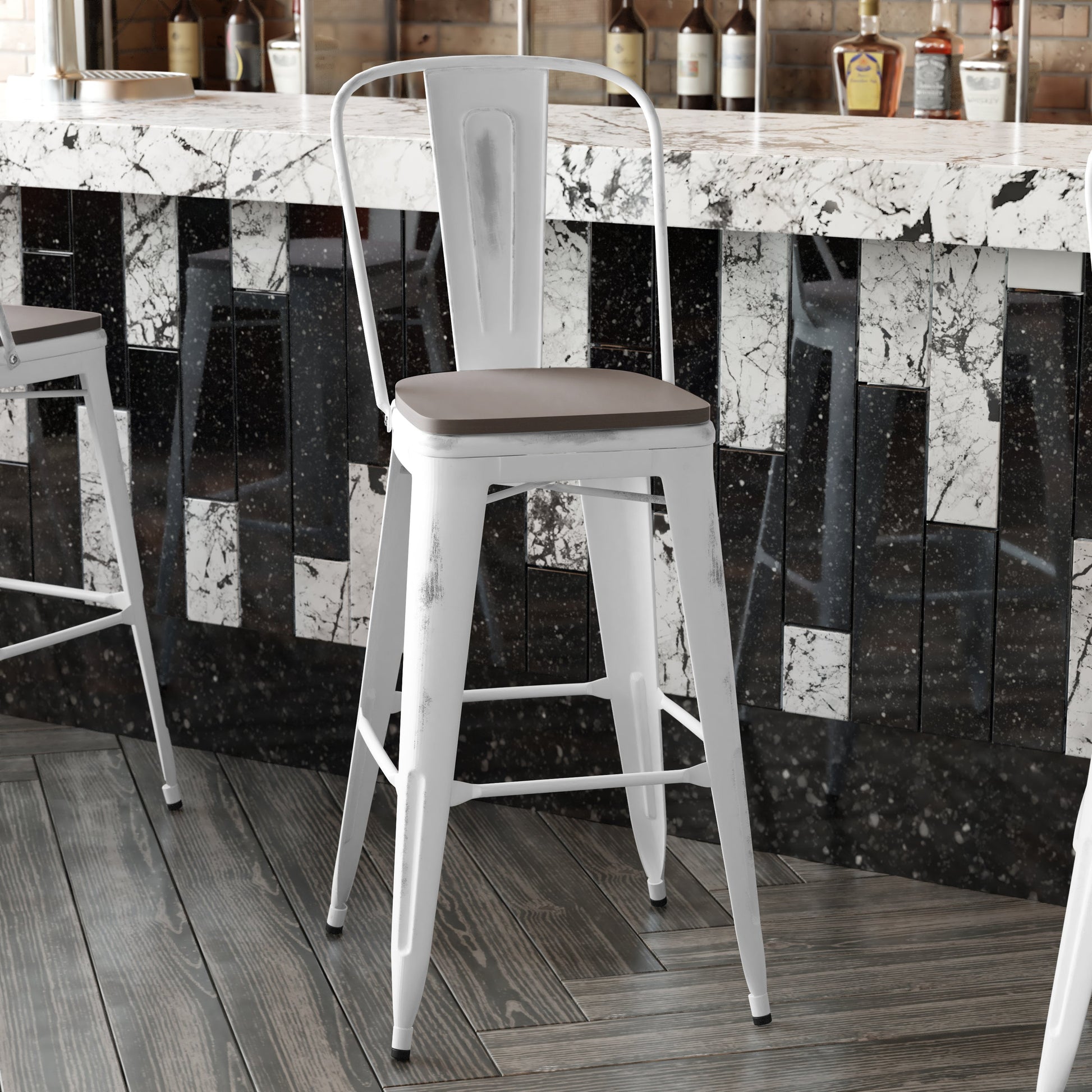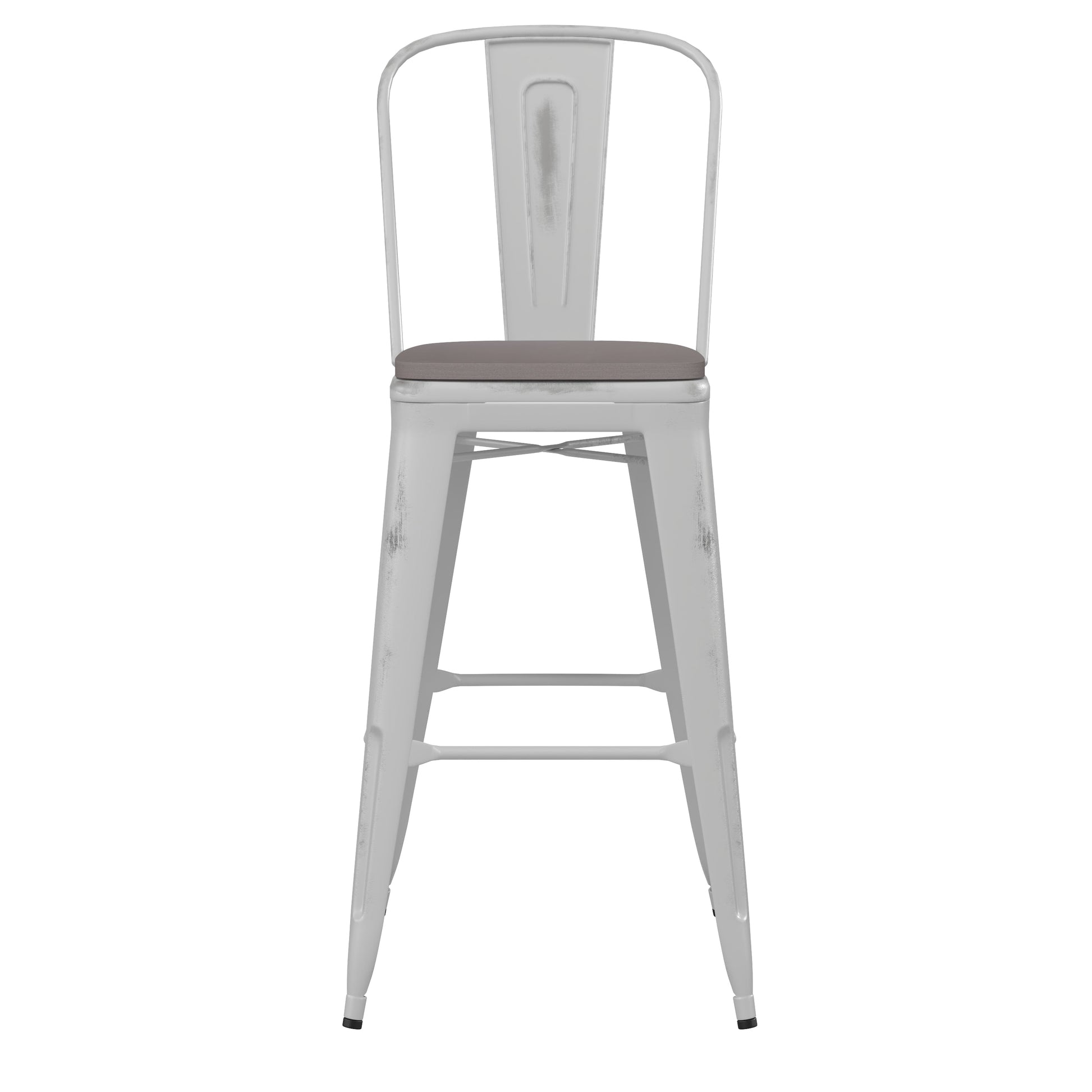 Carly Commercial Grade 30" High White Metal Indoor-Outdoor Barstool with Back with Gray Poly Resin Wood Seat Dimensions: 18"W x 19"D x 46"H