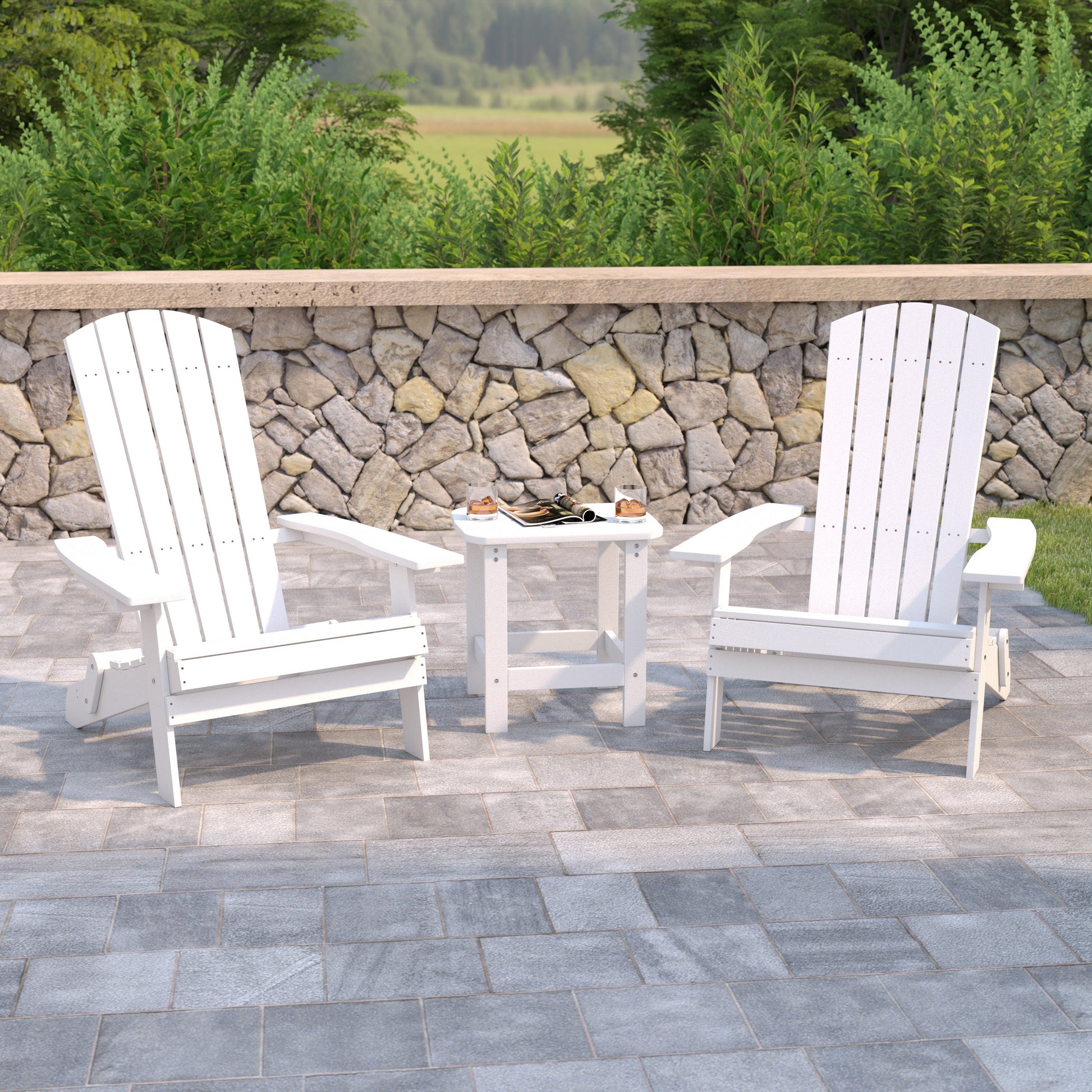 2 Pack Charlestown Commercial All-Weather Poly Resin Folding Adirondack Chair with Side Table Dimensions: 30.25"W x 34"D x 37"H