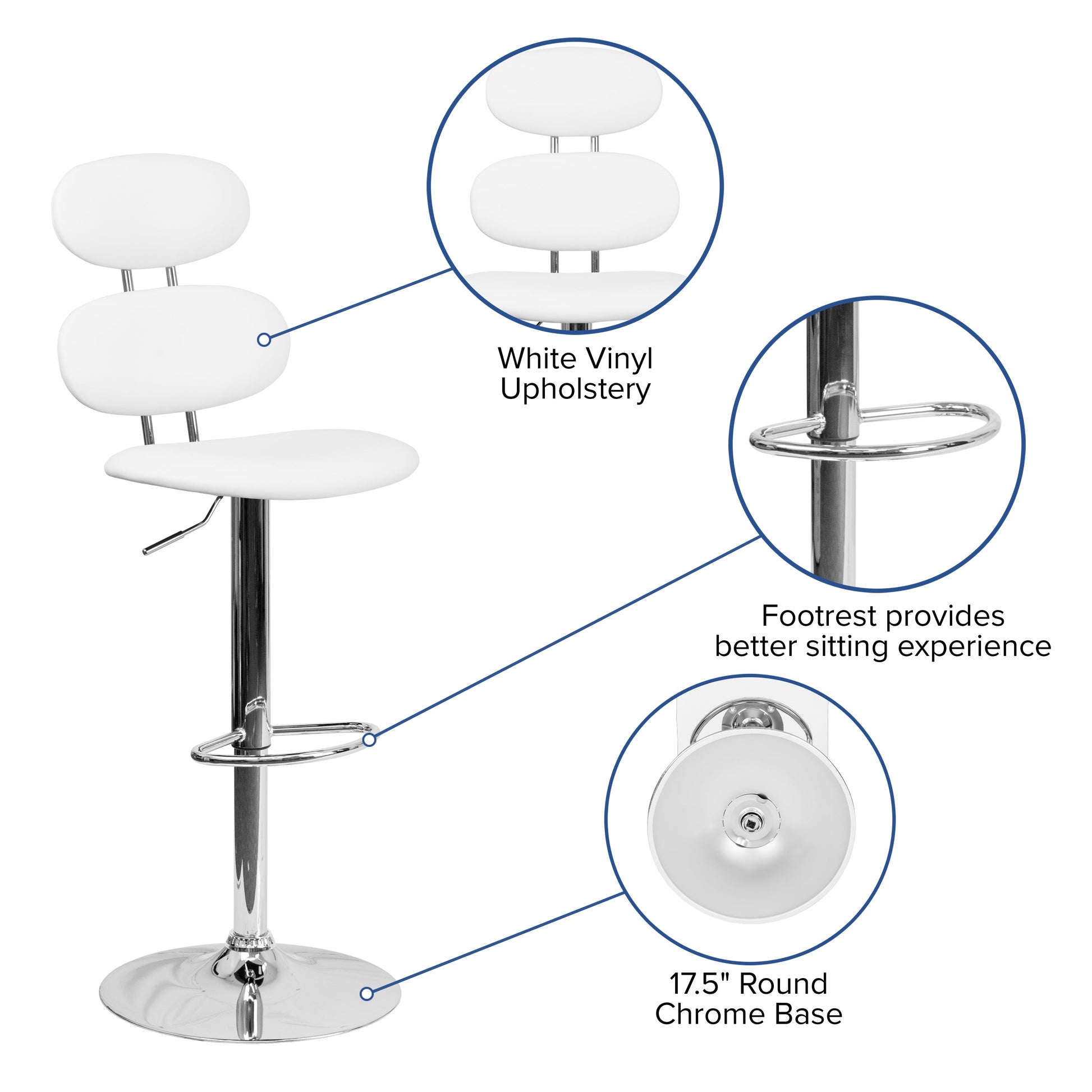 Dexter Contemporary White Vinyl Adjustable Height Barstool with Ellipse Back and Chrome Base Dimensions: 18.5"W x 20"D x 40" - 48"H