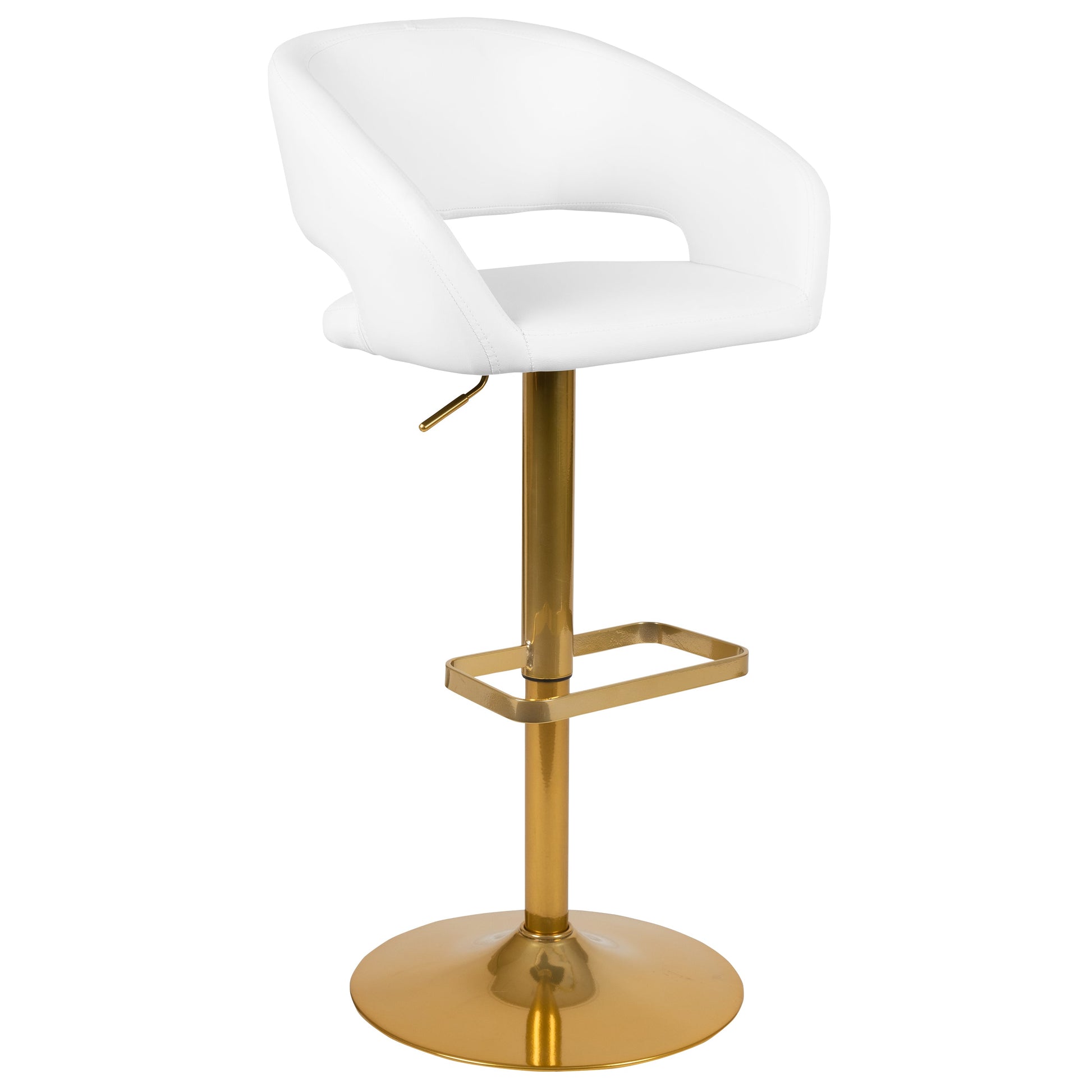 Erik Contemporary White Vinyl Adjustable Height Barstool with Rounded Mid-Back and Gold Base Dimensions: 21.5"W x 21"D x 34.25" - 42.75"H