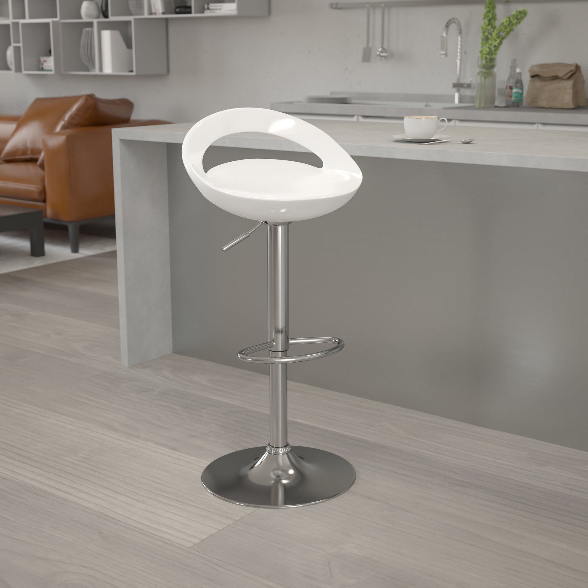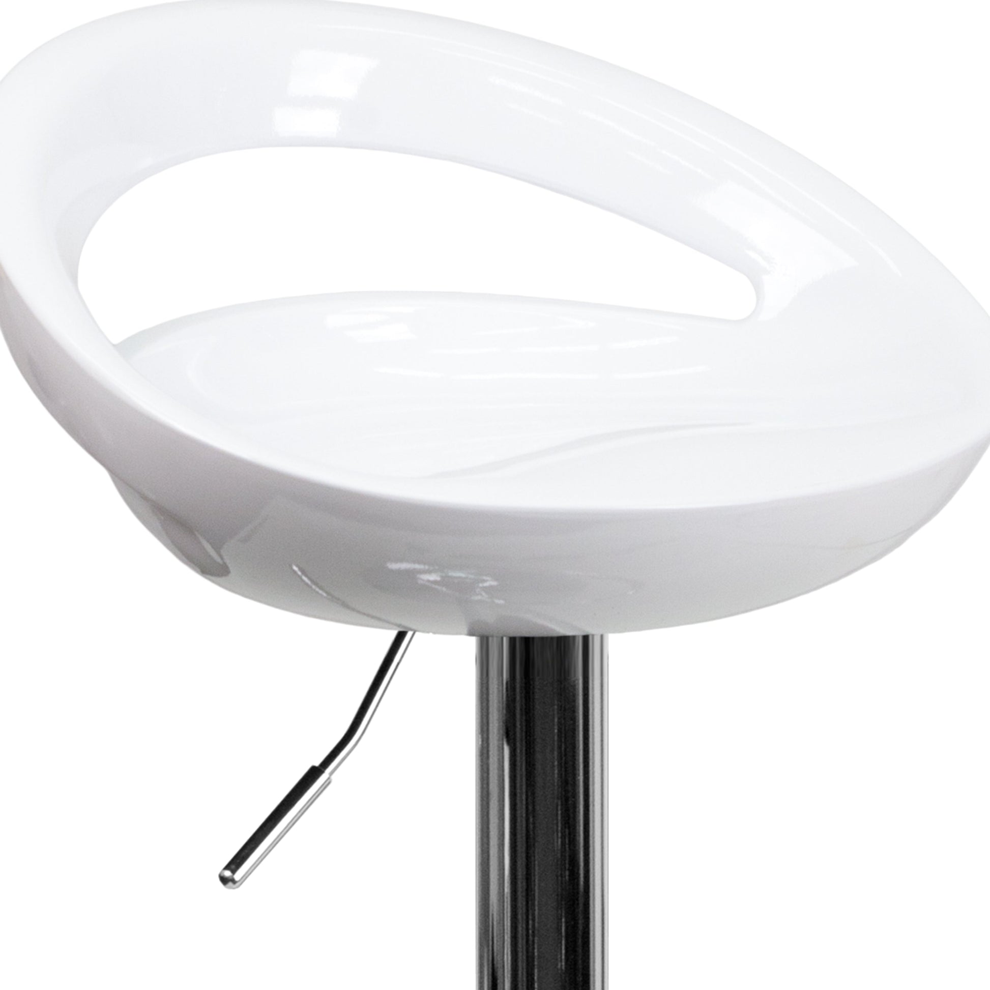 Dash Contemporary White Plastic Adjustable Height Barstool with Rounded Cutout Back and Chrome Base Dimensions: 18.25"W x 18.25"D x 30.25" - 38.75"H