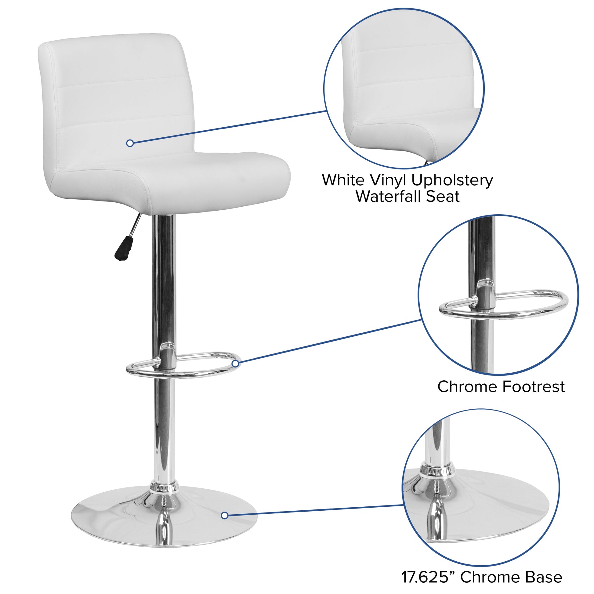 Scott Contemporary White Vinyl Adjustable Height Barstool with Rolled Seat and Chrome Base Dimensions: 16.25"W x 19.5"D x 36.75" - 44.75"H