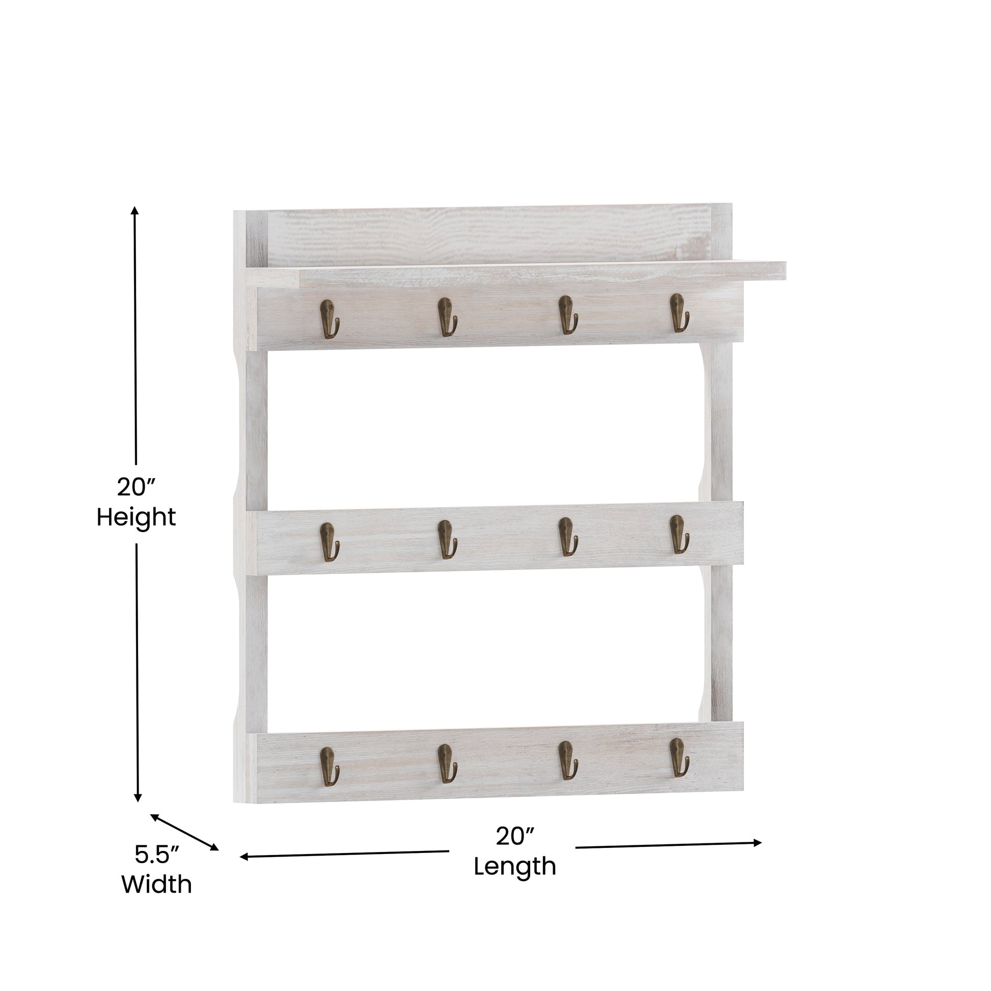 Campbell Wooden Wall Mount 12 Cup Mug Rack Organizer with Upper Storage Shelf and Metal Hanging Hooks with No Assembly Required, Whitewashed Dimensions: 20"W x 5.12"D x 20"H