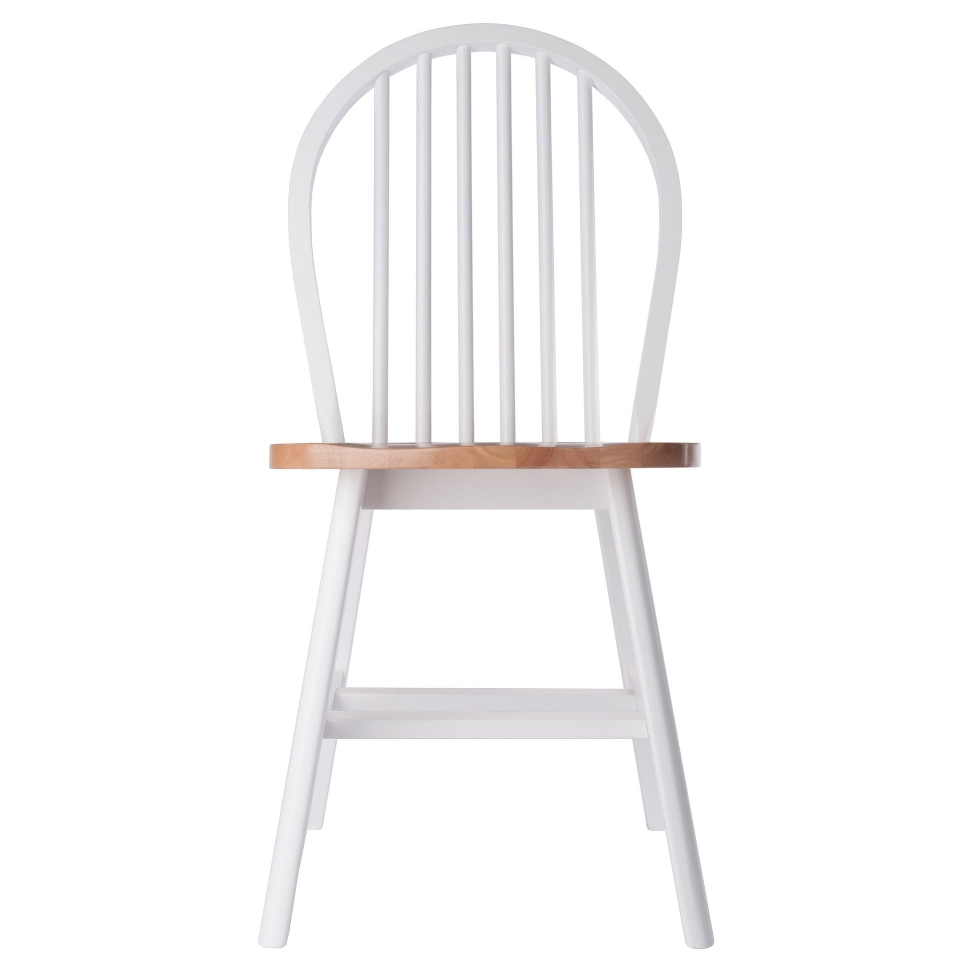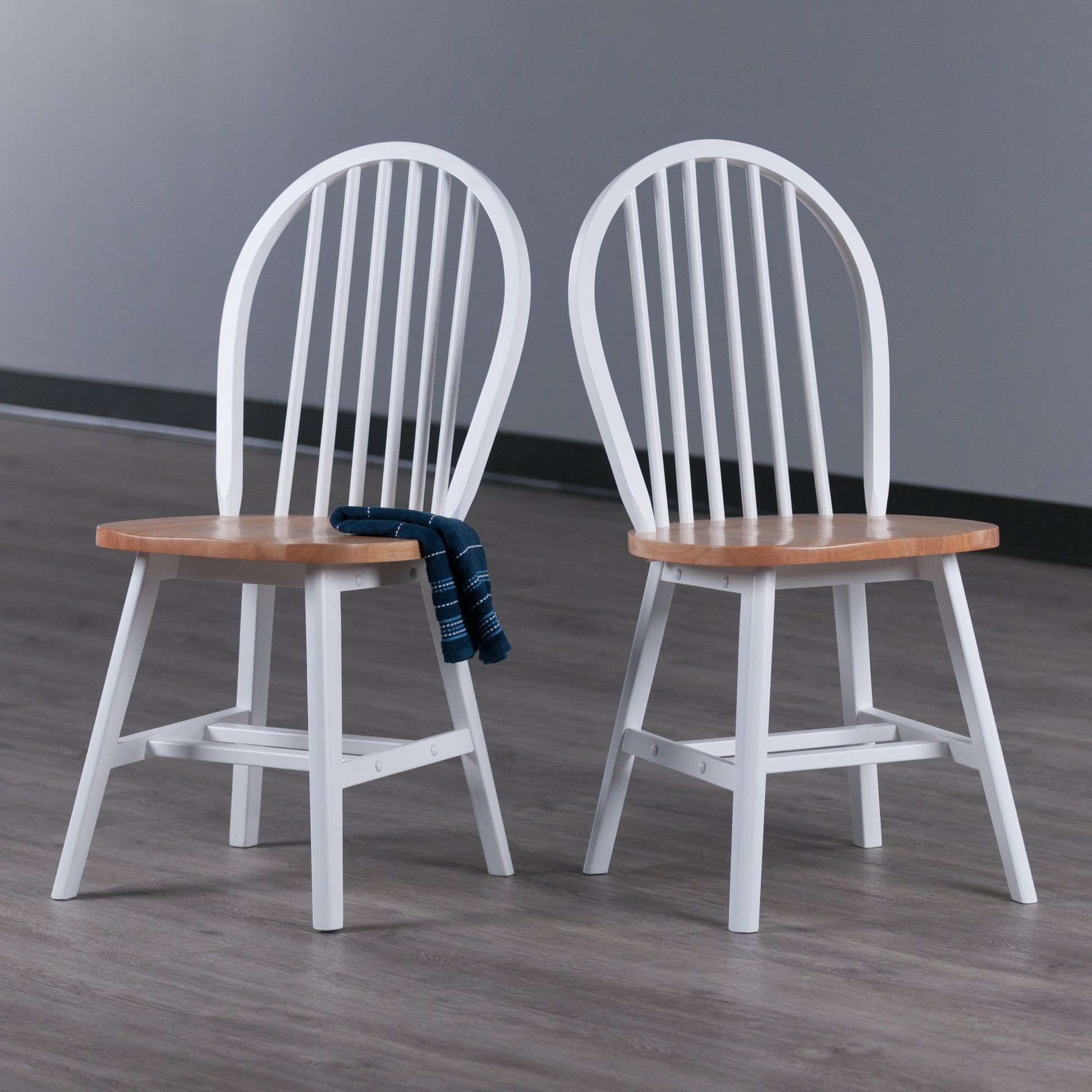 As early as the 16th century, English woodworkers began fashioning chair spindles in the same way they made wheel spokes, a design that became known as the Windsor Chair. This Winsome 2-piece set echoes that tradition. The 6-spindle arched back and the wide contoured seat offer the kind of support you want when lingering over dinner. The chairs are made of solid wood in a white and natural finish that will bring out the charm of a farmhouse kitchen or sparkle in a more contemporary setting. A double set of crossbars add durability and stability. Static weight capacity is 220 lbs. Conveniently ships in 1 box with all the hardware needed for assembly.