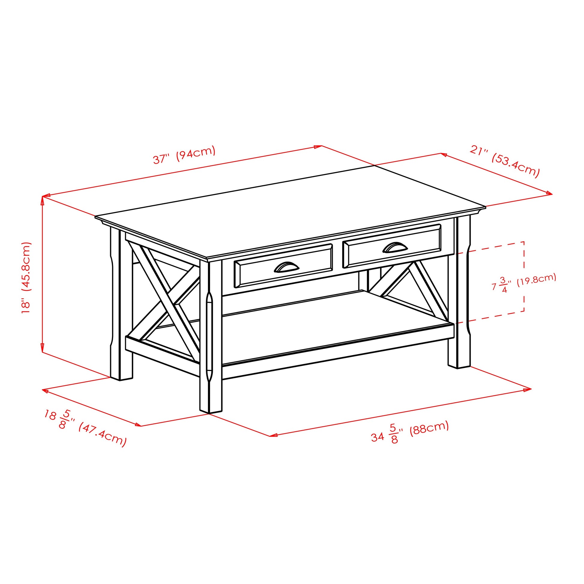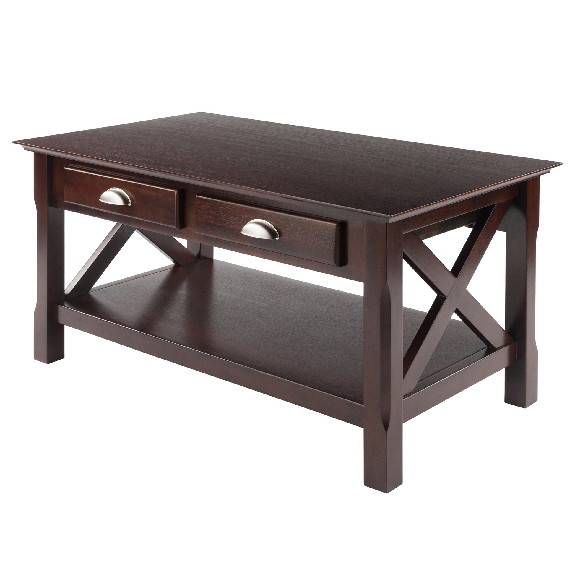 Outfit your home with style and utility of the Winsome Wood Xola Coffee Table. The Xola collection is named for its "X" cross design, pieced on each end, which adds a deeper artistic flavor and is accented by a rich, dark cappuccino finish. Ideal centerpiece to your living room, featuring two storage drawers with brushed pewter finish pulls. Perfect for keeping remotes and other electronic devices within easy reach. A lower unit-wide shelf provides extra space for books and magazines, ample storage opportunities. A bottom shelf that provides extra storage space for books or magazines. Constructed of solid and composite wood for long-lasting durability. Conveniently packed and shipped in 1 box, that includes the hardware necessary for assembling. Replacement part request can be submitted directly to the manufacturer within 60 days from date of purchase.