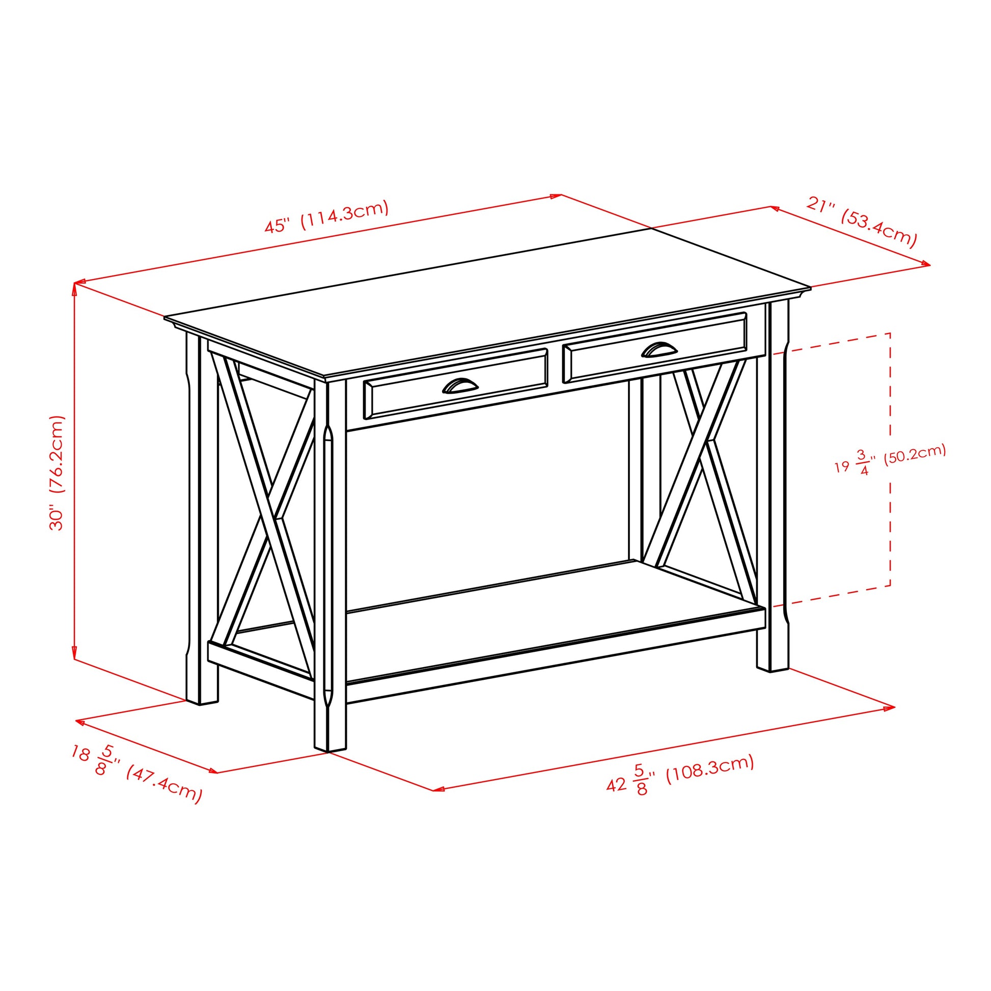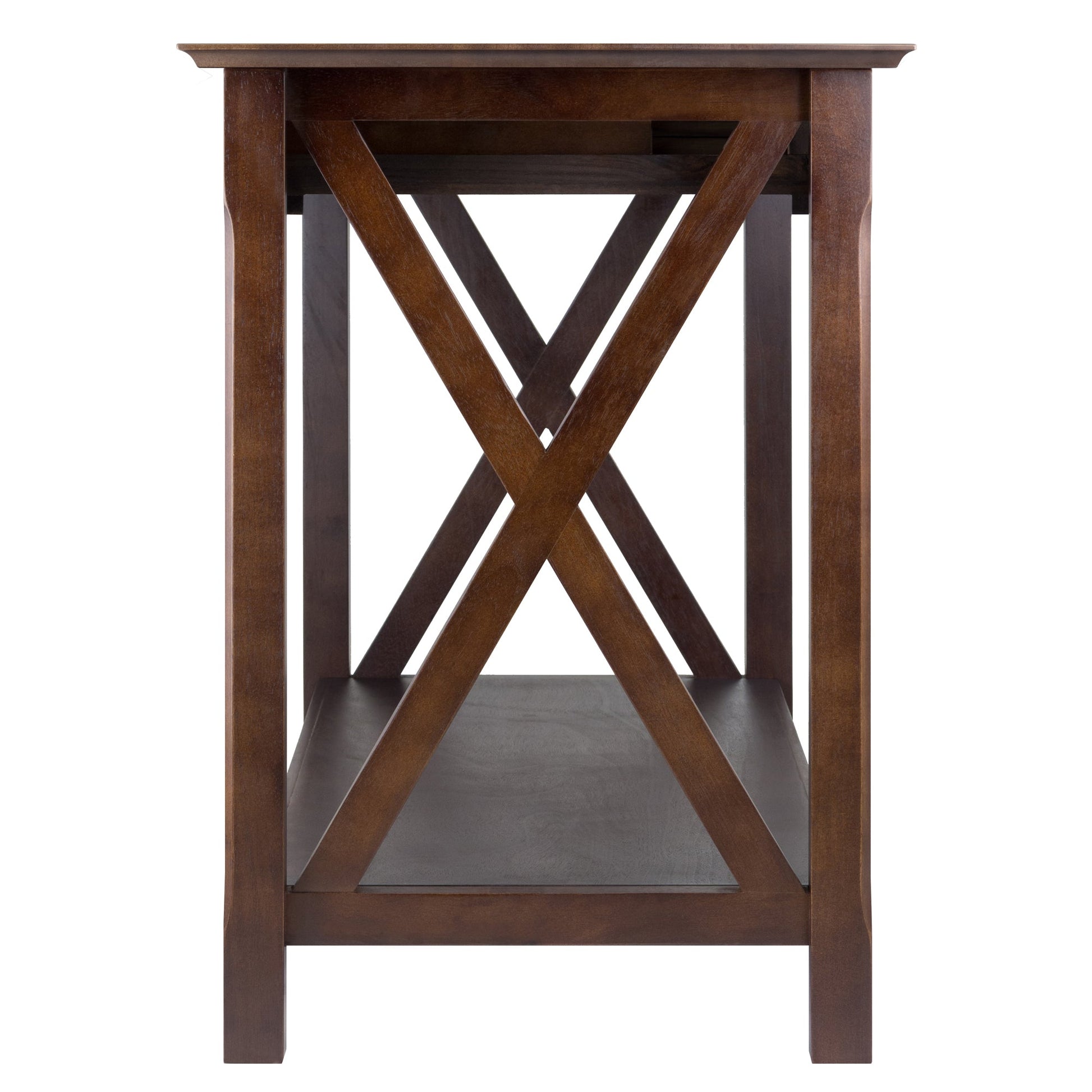 Outfit your home with the style and multi-function of the Winsome Wood Xola Console Table. The Xola collection is named for its “X” cross design, pieced on each end, which adds a deeper artistic flavor and is accented by a rich cappuccino finish. This table features two functional drawers that provide that extra storage space and drawer pulls that are stylish in a brushed pewter finish. A unit-wide bottom open shelf ideal for displaying a beautiful tall vase or simply for storing books and magazines. Perfect table to complement your entryway, hallway or living room all while still conserving space. Constructed of solid and composite wood for long-lasting durability. Complete the look with other products from the Winsome Xola collection (sold separately). Conveniently packed and shipped in 1 box, that includes the hardware necessary for assembling. Replacement part request can be submitted directly to the manufacturer within 60 days from date of purchase. Dimensions : 45 in. Wide 21.02 in. Deep 30 in. High