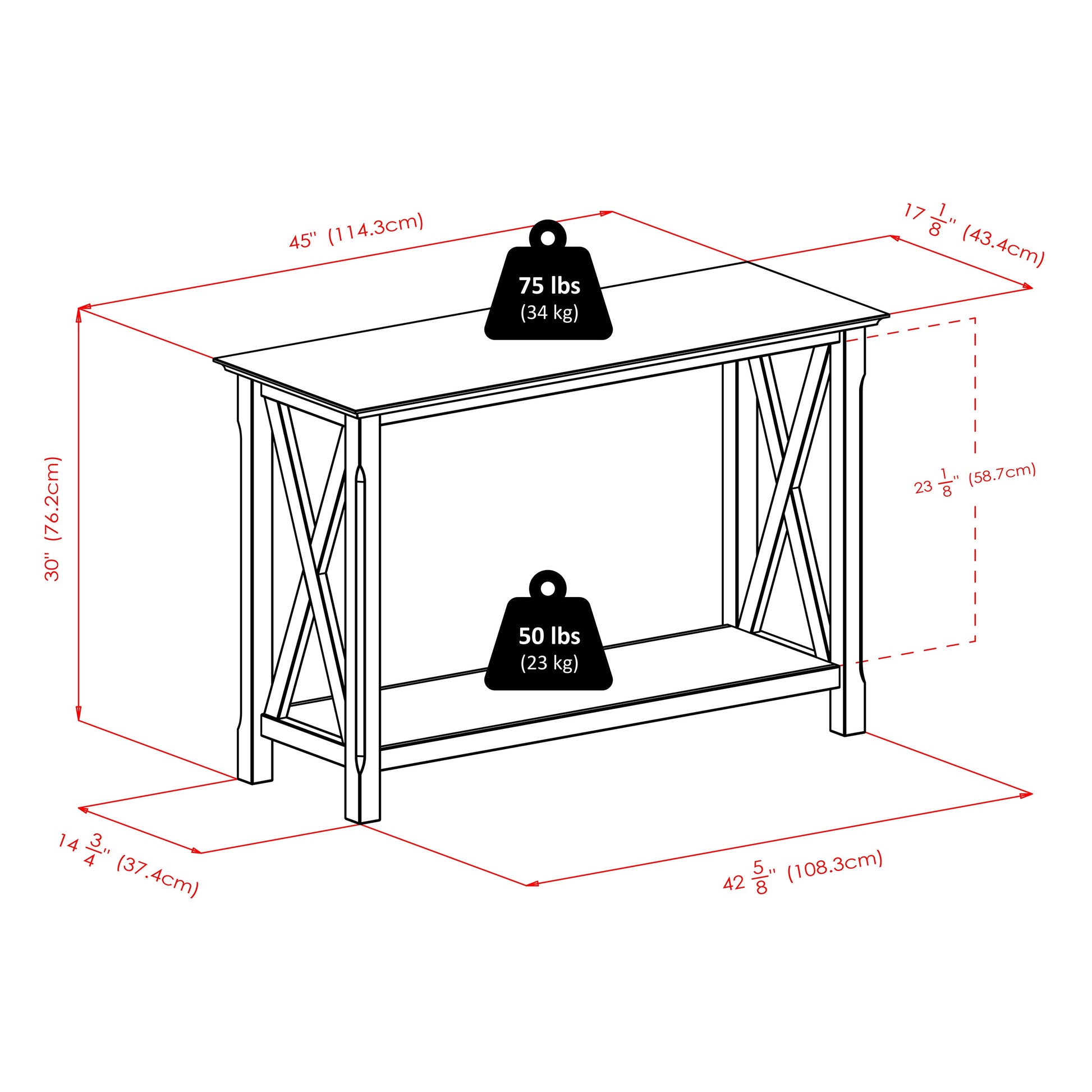 Outfit your home with style and utility when you choose the Winsome Wood Xola Console Table. The Xola collection is named for its “X” cross design, pieced on each end, which add a deeper artistic flavor and are accented by a rich, dark cappuccino finish. The X-style design give this collection a modern touch, while the richly finished wood emulates the beauty of fine furniture. Ideal for your entryway, wide hall way or any other room as a display table all while still conserving space. Ample tabletop to display collectibles or family photos. The wide-open bottom shelf has a clearance of 23.10” of height providing extra space for your knick-knacks or a flower arrangement. Constructed of solid and composite wood for long lasting durability. Complete the look with other products from the Winsome Xola collection (sold separately). Conveniently packed and shipped in 1 box, that includes the hardware necessary for assembling. Replacement part request can be submitted directly to the manufacturer within 60 days from date of purchase.Dimensions : 45 in. Wide 17.09 in. Deep 30 in. High