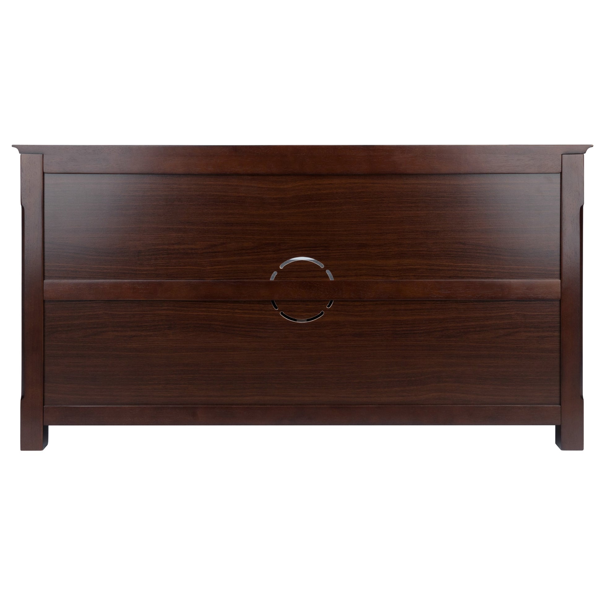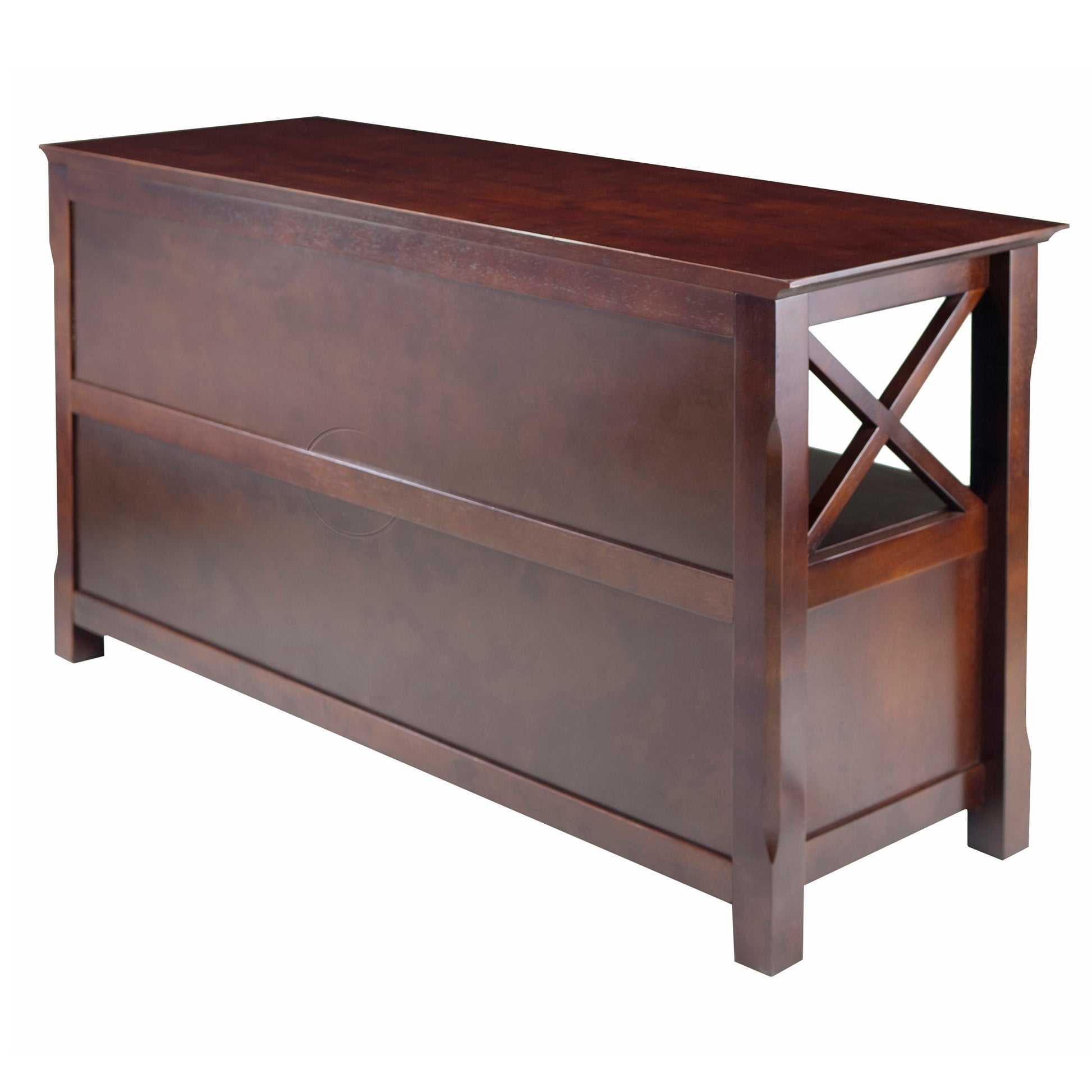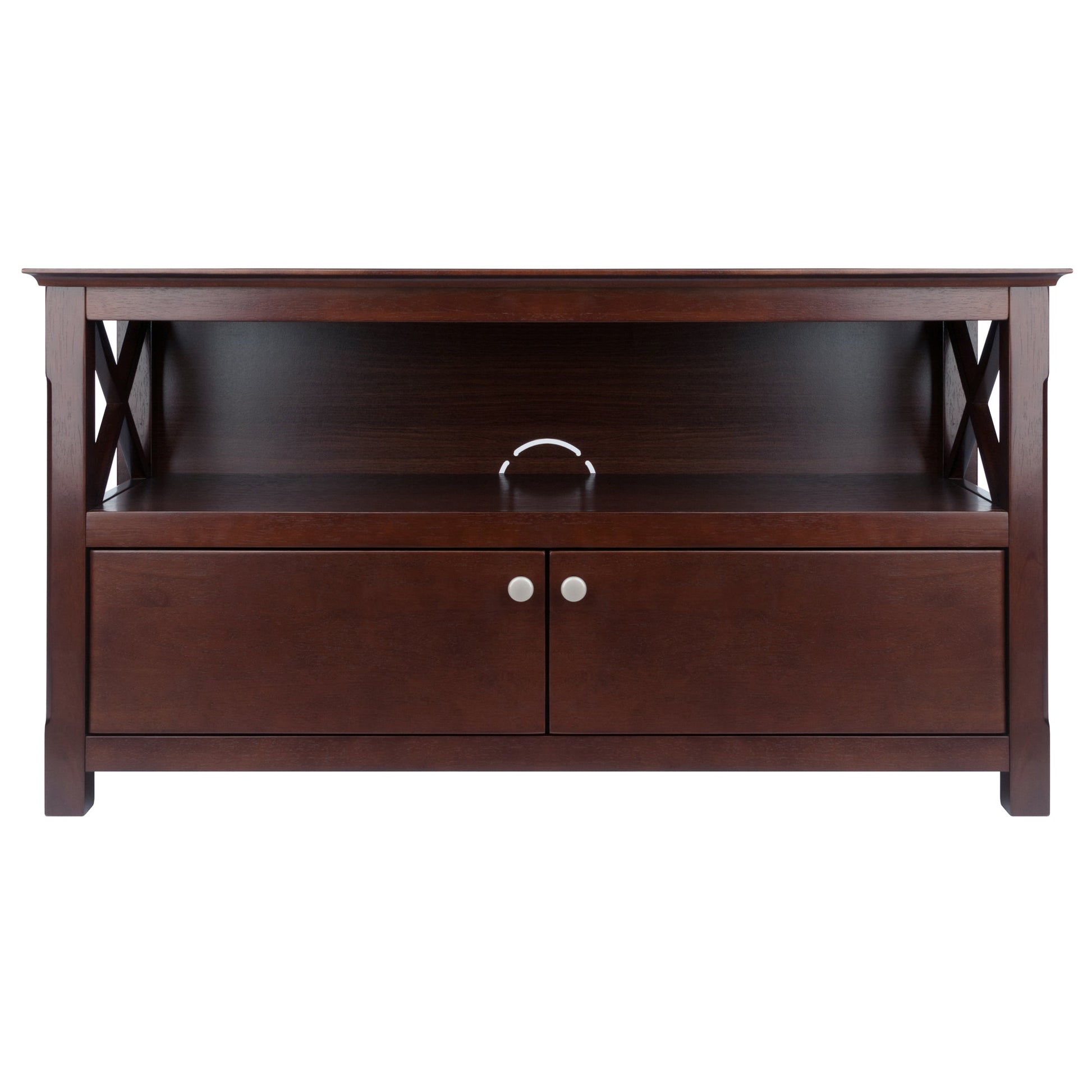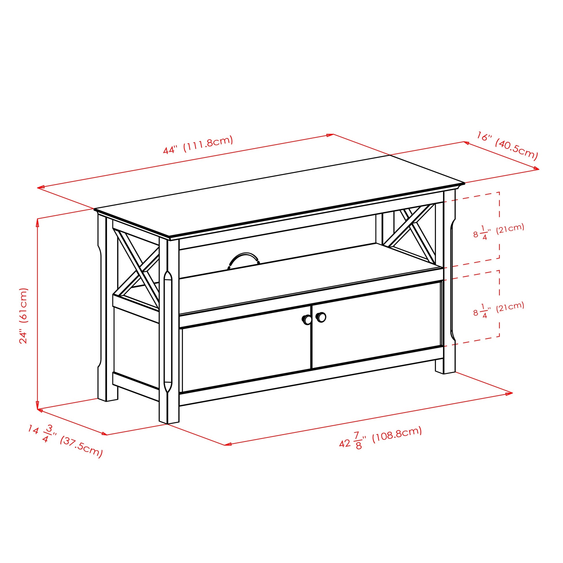 Xola family has a new member, TV stand, to help complete your room. Wide and roomy, this media center offers storage space and two wood panel doors made of quality construction and an excellent design. The contemporary look blends seamlessly into any décor. Open storage section is 39.2"W x 14.3"D x 8.2"H. Behind the two cabinet doors are 2 sections of storage each with dimension of 19.25"W x 13.5"D x 8.25"H in size. This stand can accommodate up to a 46" flat screen TV. Xola TV Stand has an overall assembled size of 44"W x 15.9"D x 24"H. Construction with combination of solid and composite wood in cappuccino finish. Assembly required.Dimensions : 44.02 in. Wide 15.94 in. Deep 24.02 in. High