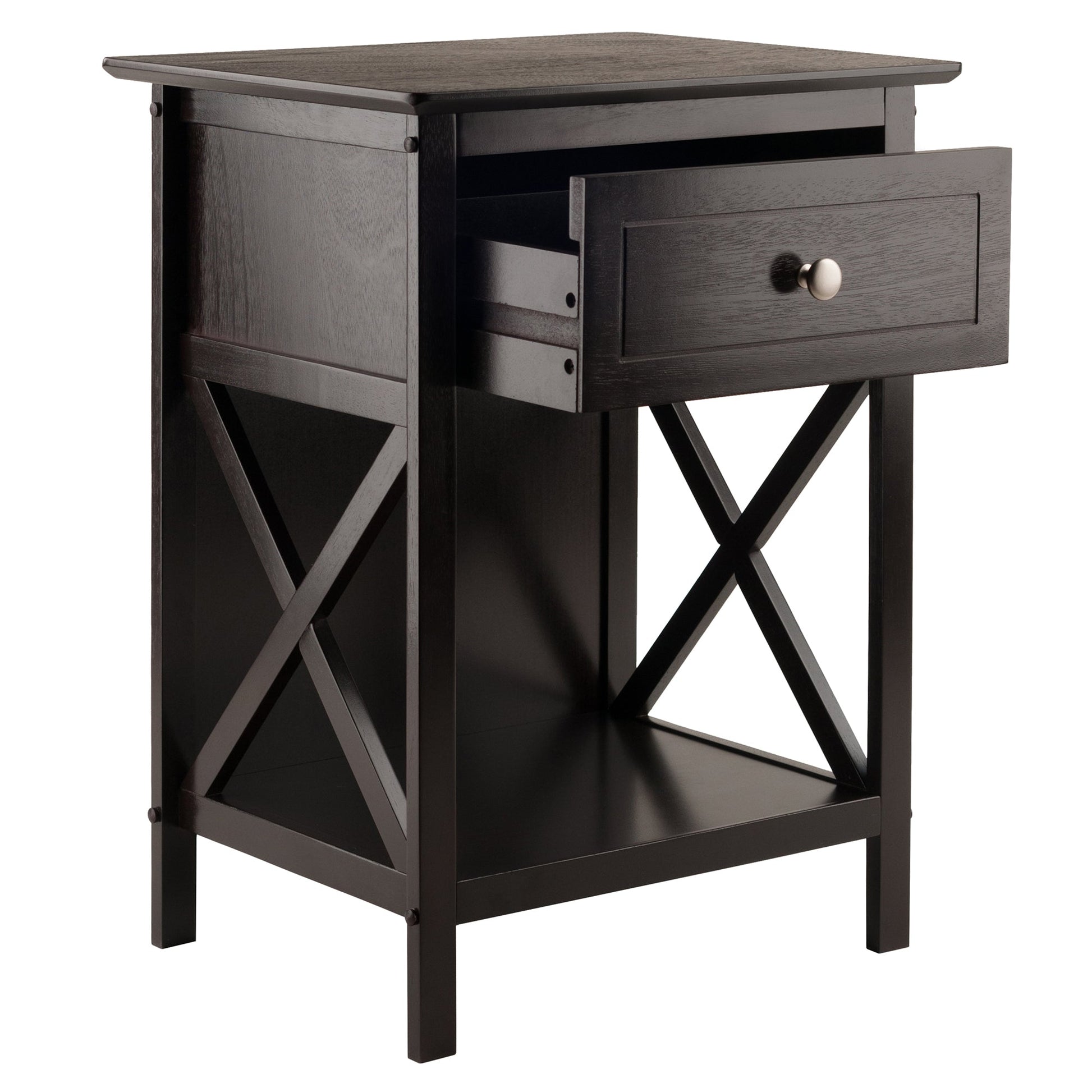 X-style side panels bring a contemporary look to the warmth of wood in the Winsome Wood Xylia Accent Table. This all-around end table will look great in the living room, as a bedside table, or as a printer stand and storage unit in your home office. The large drawer is finished with a brushed silver knob and will keep the TV remotes, an iPad, or charging wires within easy reach. A lower shelf is perfect for books, magazines, or for collectibles that will be open to view from three sides. Constructed of sturdy solid and composite wood in a rich coffee finish. For larger beds, sofas or rooms, try adding one accent table on each end to unify the space (each sold separately). Conveniently packed and shipped in 1 box that includes the hardware necessary for assembling. Replacement parts can be requested directly to the manufacturer within 60 days from date of purchase.