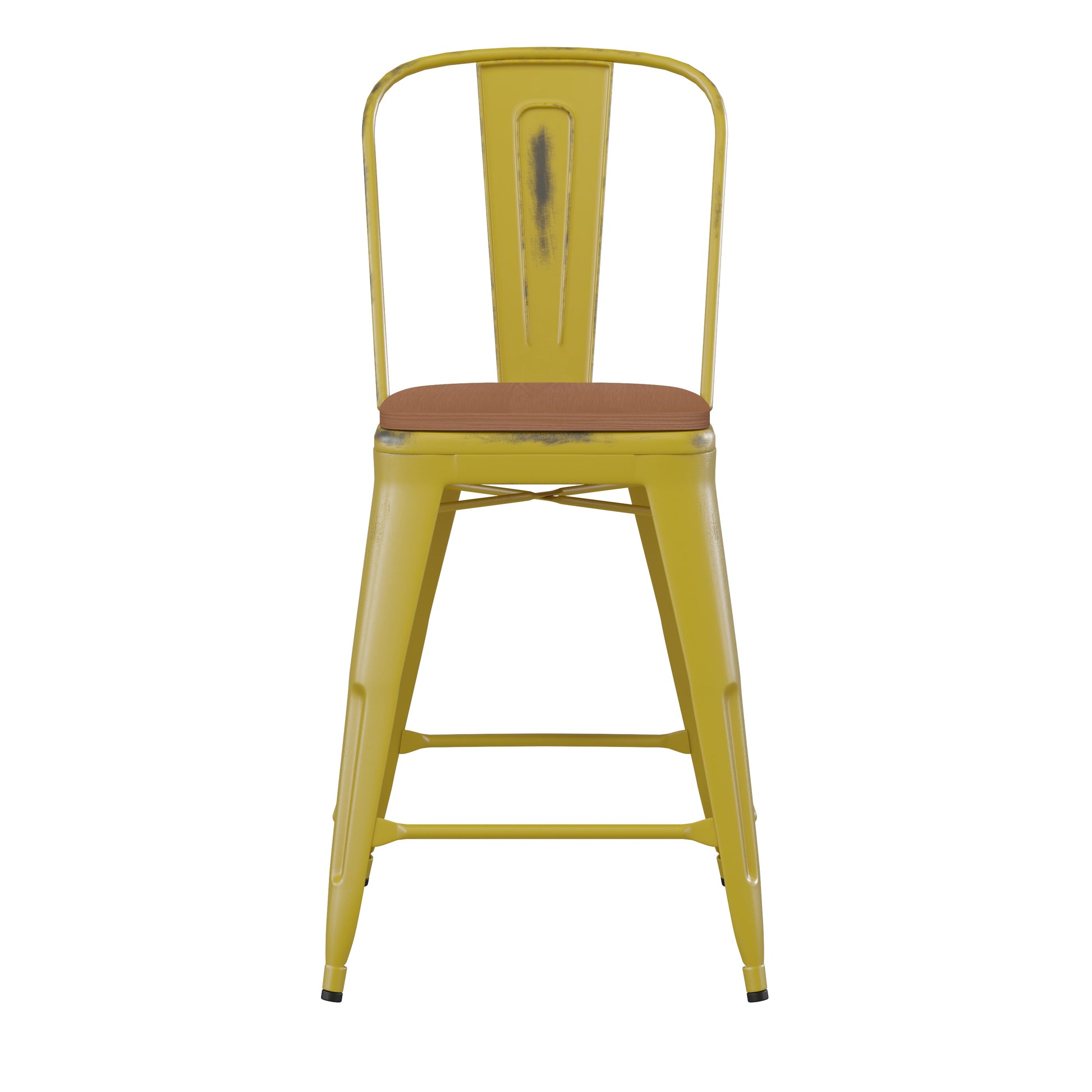 Carly Commercial Grade 24" High Yellow Metal Indoor-Outdoor Counter Height Stool with Back with Teak Poly Resin Wood Seat Dimensions: 17.75"W x 22"D x 40.25"H