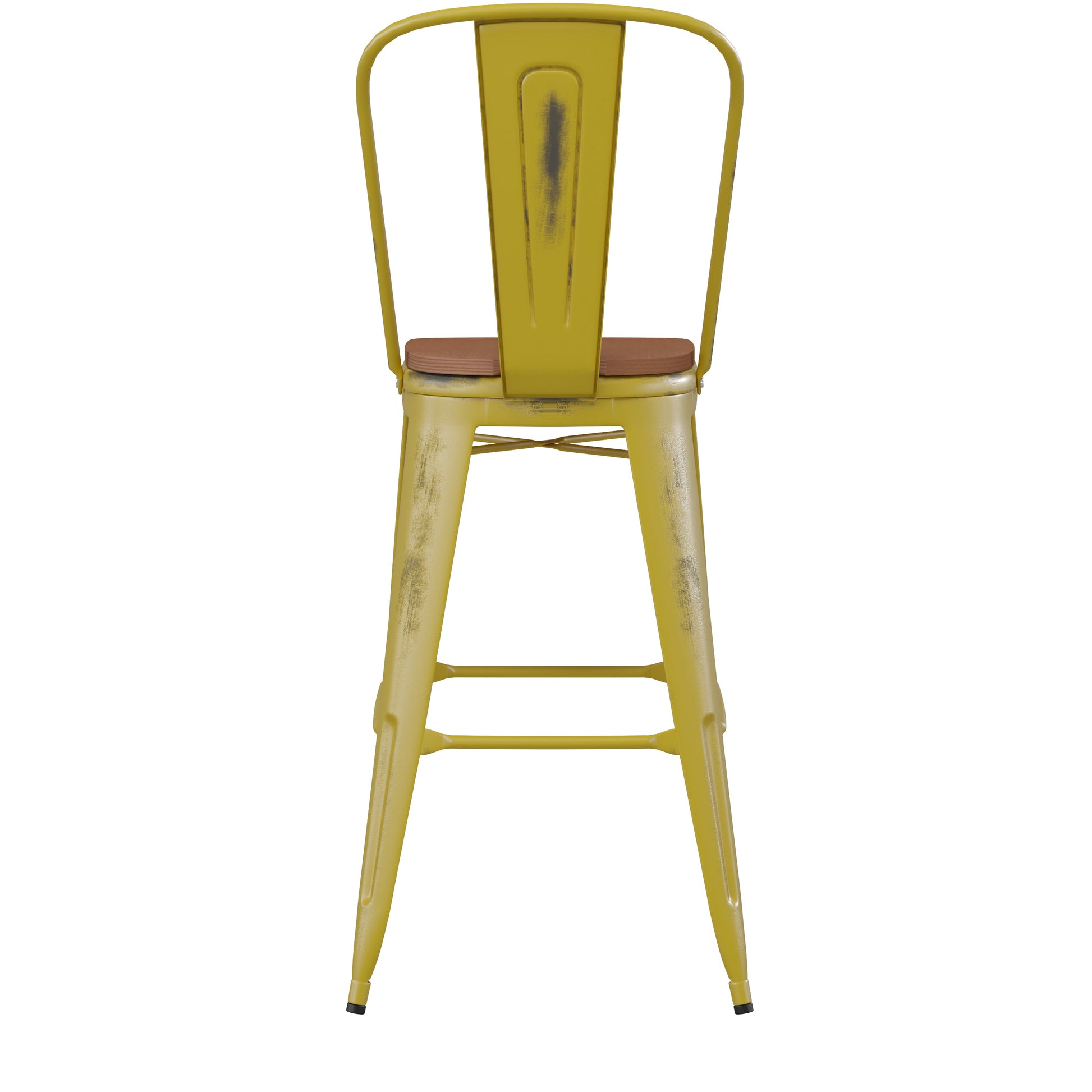 Carly Commercial Grade 30" High Yellow Metal Indoor-Outdoor Barstool with Back with Teak Poly Resin Wood Seat Dimensions: 18"W x 19"D x 46"H