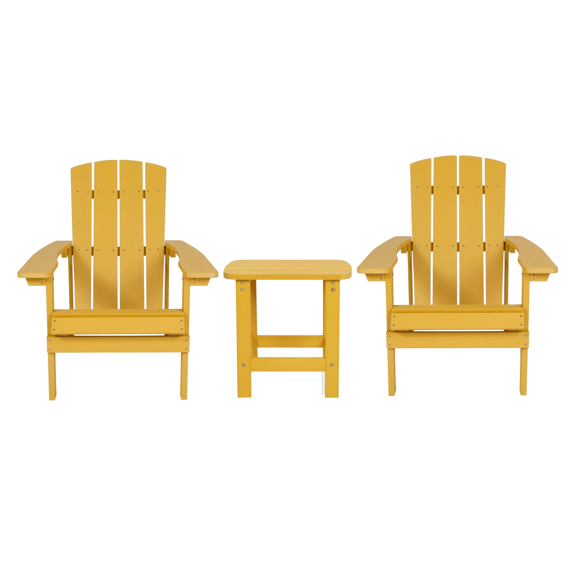 2 Pack Charlestown Commercial All-Weather Poly Resin Wood Adirondack Chairs with Side Table in Yellow Dimensions: 29.5"W x 33.5"D x 35"H