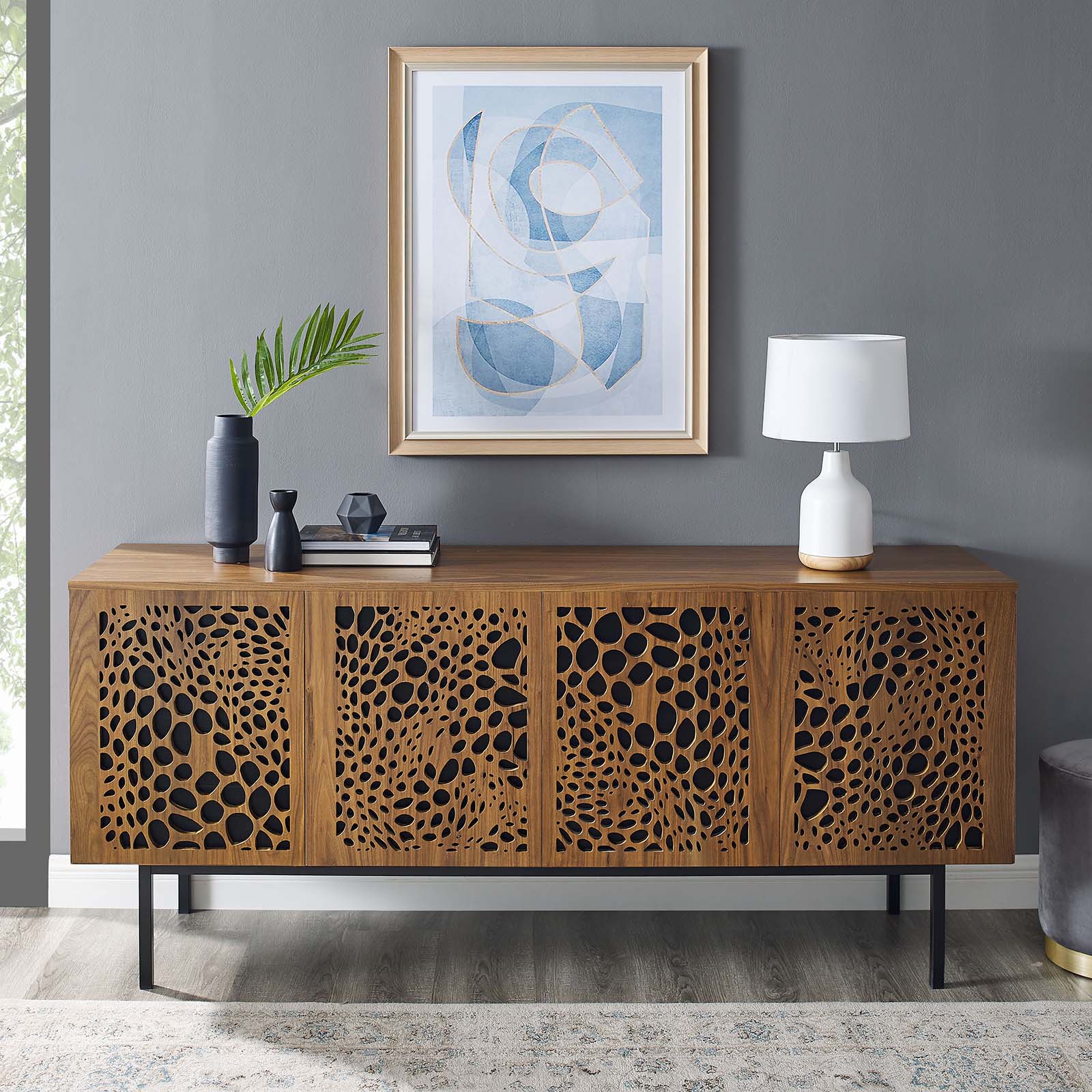 Redefine your living space with the Yosemite TV Stand. Featuring a nature-inspired design and organic aesthetics, this wooden TV stand brings stylish functionality to the living room, bedroom, and home office and its versatility allows it to double as a credenza, sideboard, buffet, or display stand in the dining room or entryway. Yosemite is crafted with MDF with walnut wood veneer and rests on powder-coated iron tube legs. Featuring a breezy design for flow-through ventilation, this TV stand is complete with adjustable-height shelves, anti-toppling straps, a cable management hole, and sliding doors that make up the back panel. The front doors of this media console feature an unrefined natural look and soft-close hinges. Keep visual space clean with the ample storage space for media essentials with this TV stand that accommodates flat screen TVs up to 75".