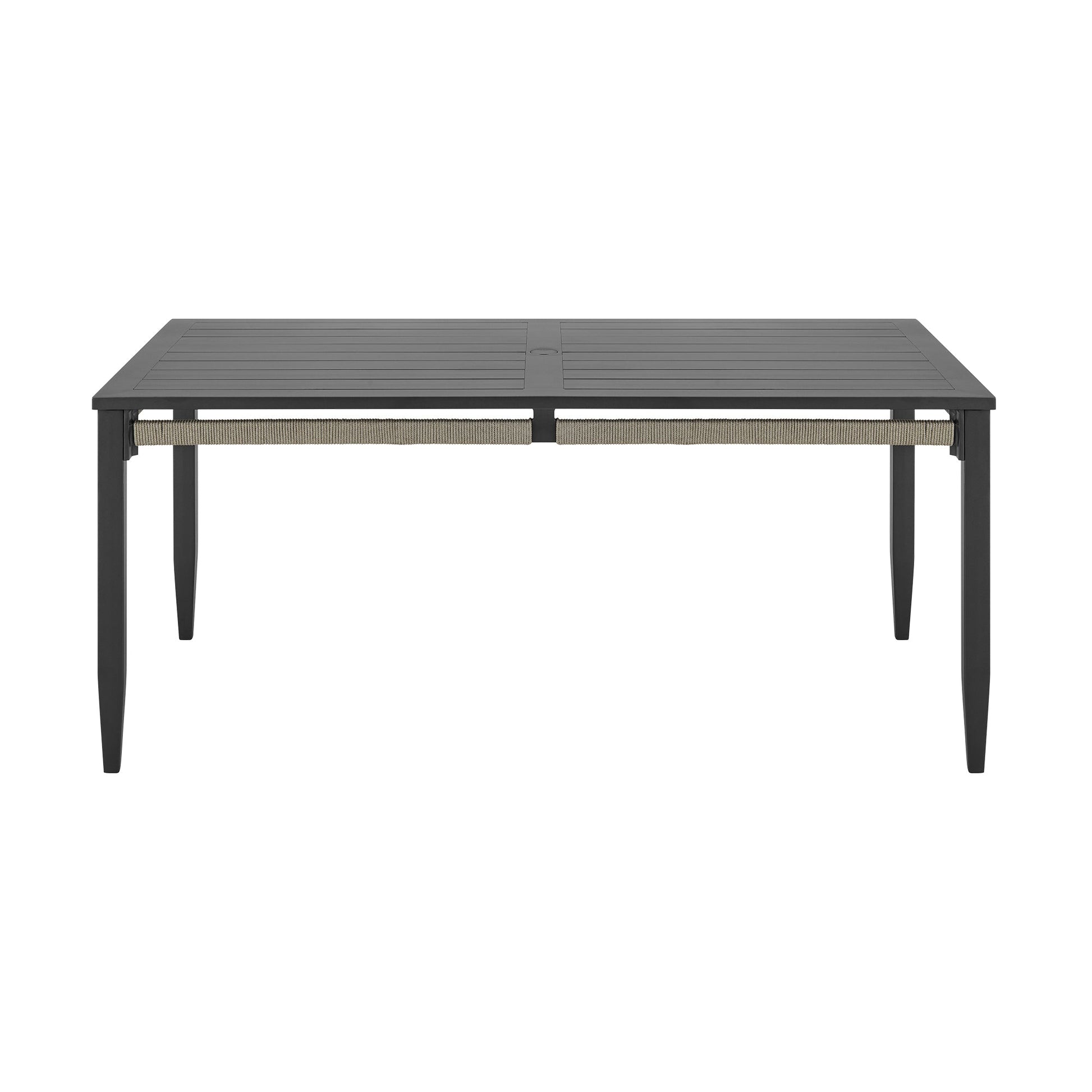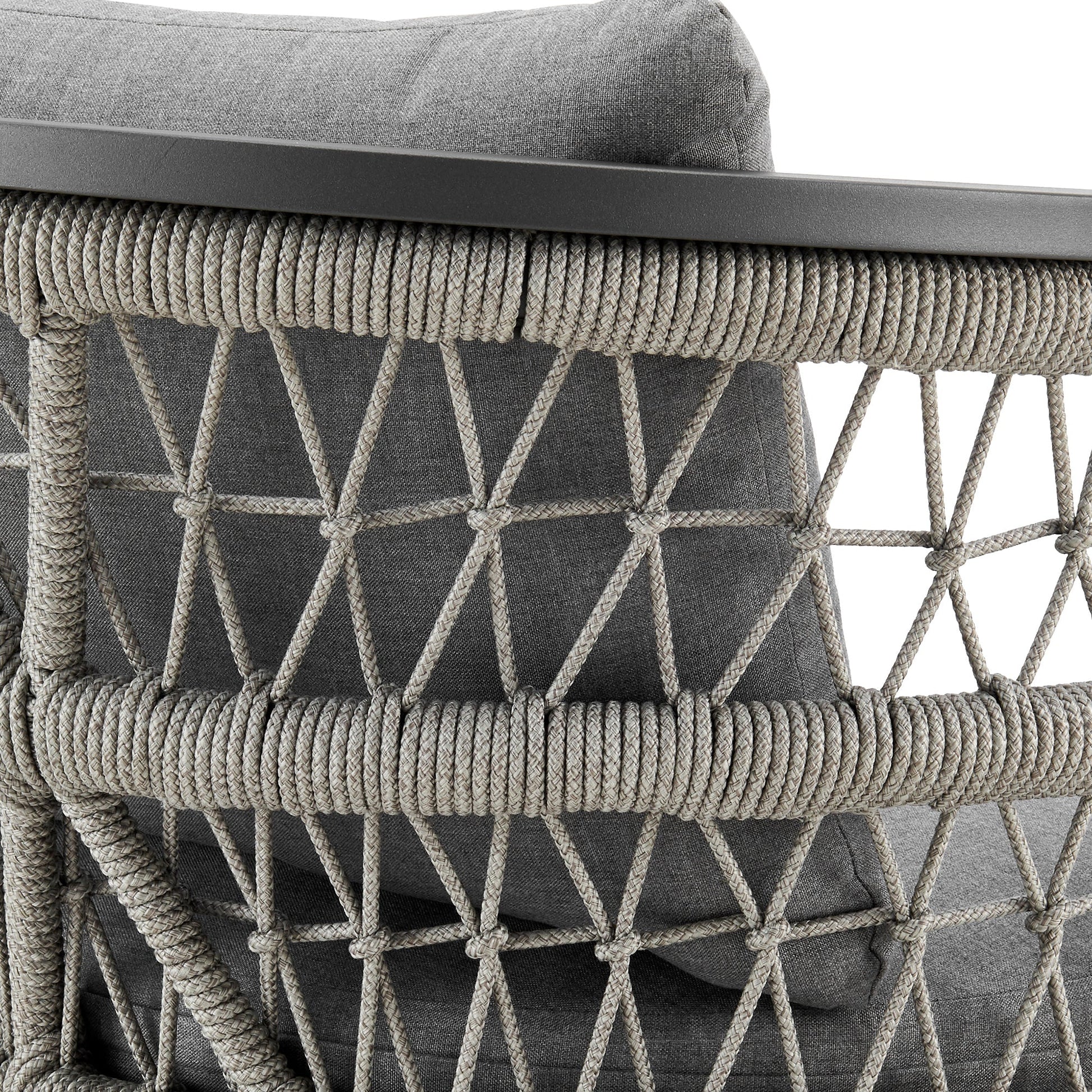 Introducing the Zella Outdoor Patio 7 Piece Dining Set in Aluminum with Light Gray Rope and Cushions — a perfect fusion of modern design and outdoor comfort meticulously crafted to elevate your outdoor dining experience. The set combines the sleek allure of aluminum with the inviting texture of light gray rope detailing and plush Earl Gray cushions made from solution-dyed acrylic fabric, creating a sophisticated and enduring ensemble. The Zella Outdoor Patio Dining Chair, a harmonious masterpiece, features a robust aluminum frame for durability and contemporary aesthetics. Water-resistant and UV-resistant, these chairs stand as reliable and stylish seating solutions for your patio or outdoor dining area. The incorporation of light gray rope detailing adds a unique visual dimension, creating a captivating contrast with the smooth aluminum frame. Paired with Earl Gray cushions, these dining chairs invite you to dine in both style and comfort, whether hosting a lively dinner party or enjoying a quiet family meal. Completing the set is the Zella Rectangular Dining Table, a sophisticated centerpiece meticulously crafted to redefine your outdoor dining experience. With a sturdy aluminum frame and a refined charcoal finish, this table effortlessly complements various outdoor settings. The inclusion of light gray rope detailing adds a unique visual dimension, creating a captivating contrast with the smooth aluminum frame. Designed for outdoor durability, the Zella Dining Table features water-resistant and UV-resistant attributes, remaining a steadfast and stylish addition to your patio. Whether hosting a large outdoor dinner party or enjoying a cozy family meal, this table offers a spacious and inviting setting for your dining needs. Transform your outdoor dining space with the Zella Outdoor Patio Dining Set, where contemporary elegance meets the demands of modern outdoor living.