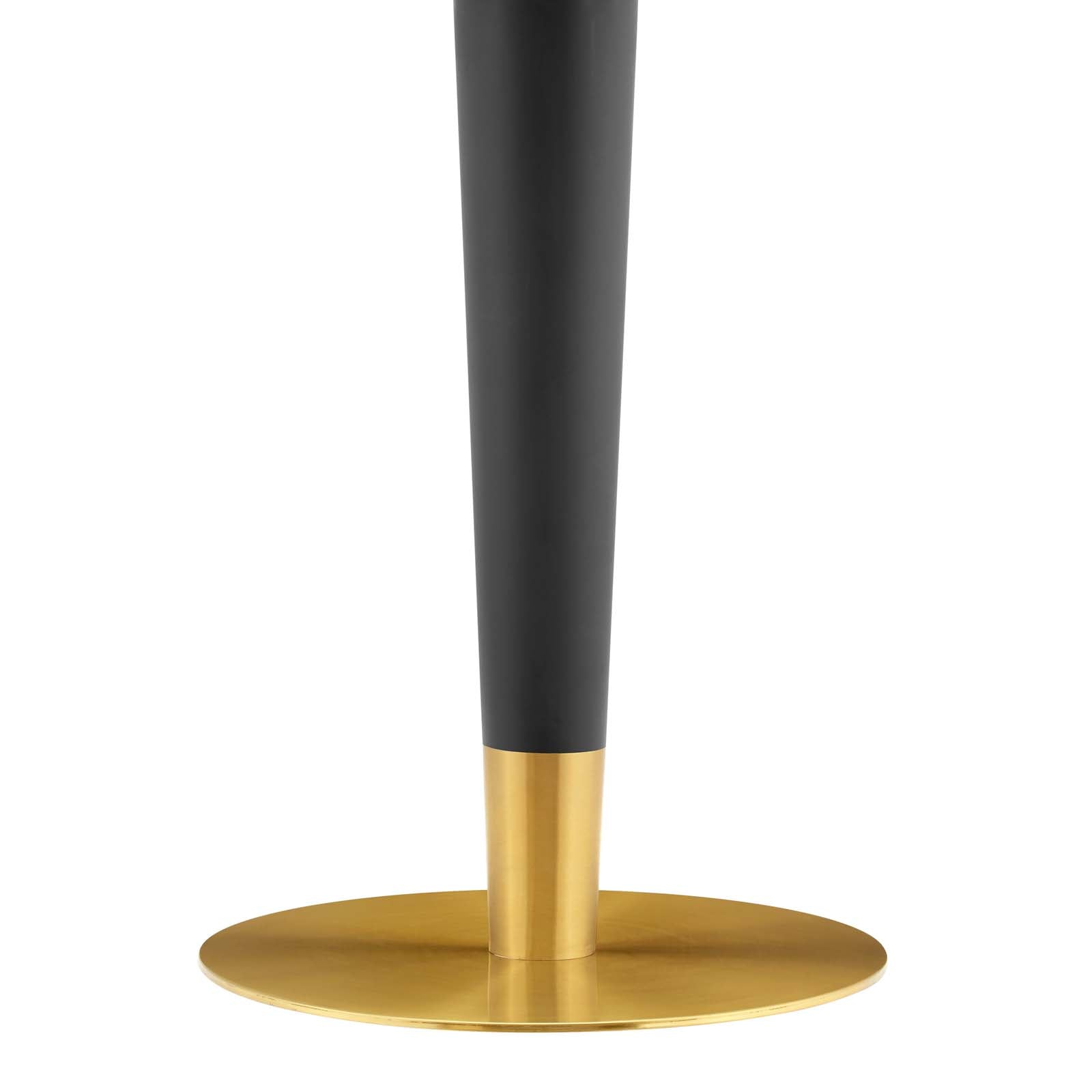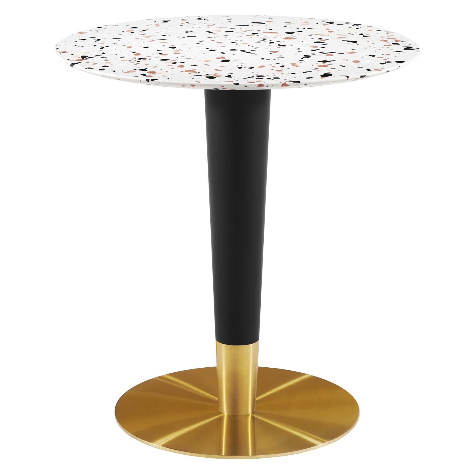 Gather family and friends for good food and conversation around the Zinque Dining Table. Bringing modern influence and mid-century inspiration to your dining space, this pedestal table reflects an organic shape. Perfect for entertaining or everyday dining, this dining table rests on a black and polished gold tapered base and features a 28" terrazzo tabletop. Non-marking ring to protect flooring. Assembly required.