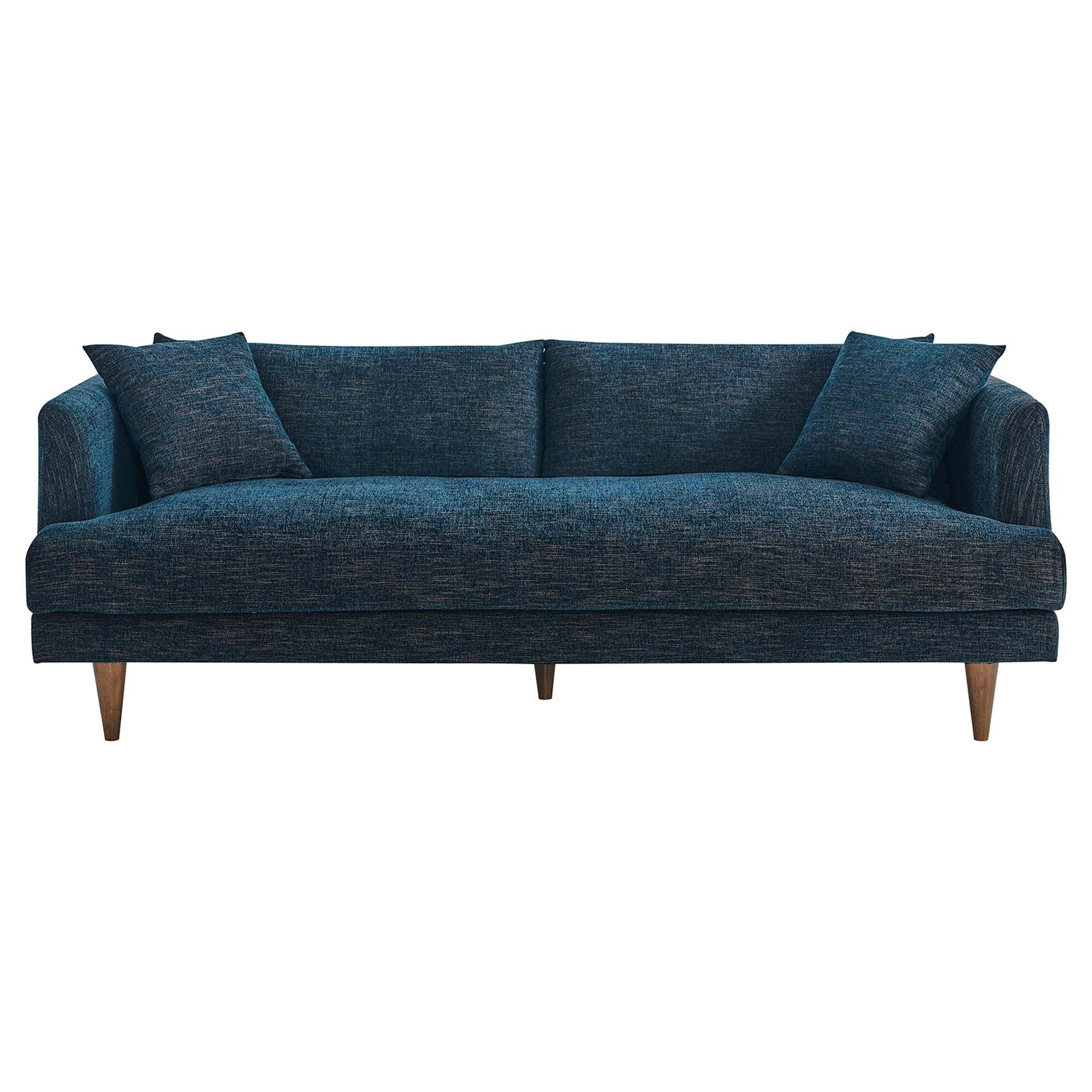Dive deep into comfort and conversations with the Zoya Upholstered Down-Filled Sofa. The perfect addition to modern living rooms, family rooms, or game rooms, Zoya's design invites you into an immersive lounging experience, with a low, comfortable profile and spacious deep seating. Upholstered in polyester fabric with a down blend and dense foam filling, this living room sofa provides a soft, cloud-like sensation that retains its shape. Accompanied by back cushions and two square throw pillows, this sofa delivers a lounging experience optimized for comfort. The convenience of removable and washable cushions makes maintenance a breeze. Underneath a lavish exterior, Zoya integrates pocket springs, which offer added support, and comes perched on sleek tapered rubberwood legs and set on a solid wood frame. Whether you're hosting a movie night or reading your favorite book, the Zoya Fabric Sofa is your ticket to a luxurious lounge. Comes equipped with non-marking foot caps. Assembly required. Weight capacity: 600 lbs. Overall Product Dimensions: 42.5"L x 84.5"W x 33.5"H