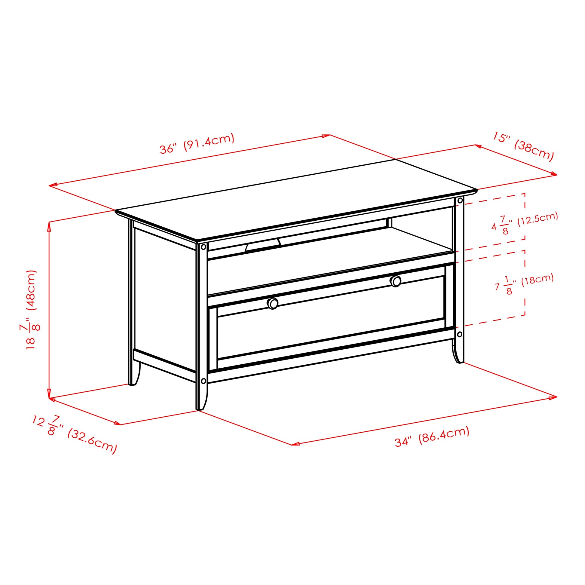 Place your flat-panel television on the sleek-looking Winsome Wood Zuri TV Media Stand. The clean lines and simple design makes this a great addition to your living room or family room. The large surface can accommodate up to a 42" flat-panel TV and provides plenty of storage for your electronics, games, and movies. Whether it's in the open shelf or behind the pulldown door that opens up to reveal plenty more storage space. Put away CDs, DVDs, your multimedia box, cable box, video game console and other media accessories. Connect all your electronics to your TV through the wire-access grommet that is centered in the back panel of the stand, helping you achieve a clean look. The stand is made from a combination of solid and composite wood in a rich Espresso finish that will compliment most decor. Conveniently packed and shipped in 1 box, that includes the hardware necessary for assembling. Replacement part request can be submitted directly to the manufacturer within 60 days from date of purchase.Dimensions : 35.98 in. Wide 14.96 in. Deep 18.9 in. High